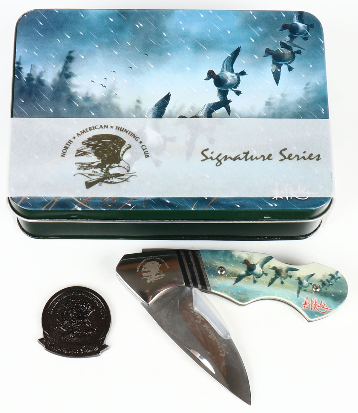 Signature Series Red Heads Battle snow by Les Kouba, folding knife, in box. Grade: Excellent ++ - Value: 20 to 40