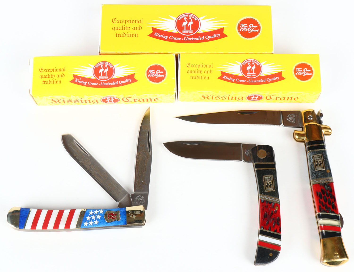 Lot of 3 Kising Crane folding knives, in box. Grade: Excellent ++ - Value: 16 to 50