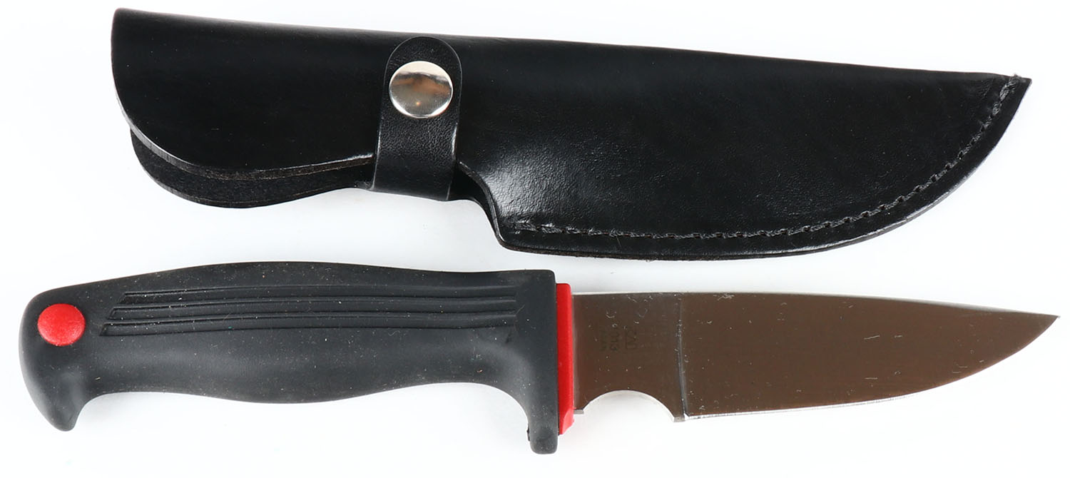 Fixed blade knife, Kershaw knife, has leather sheath, 4'' blade. Grade: Excellent - Value: 20 to 80