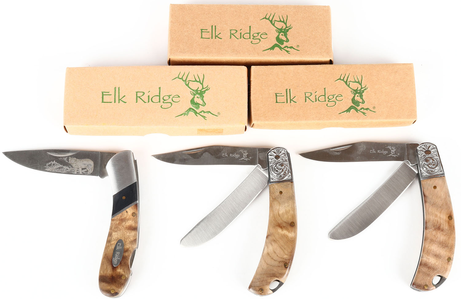 Lot of 3 Elk ridge folding knife and has original box! Grade: Excellent ++ - Value: 20 to 60