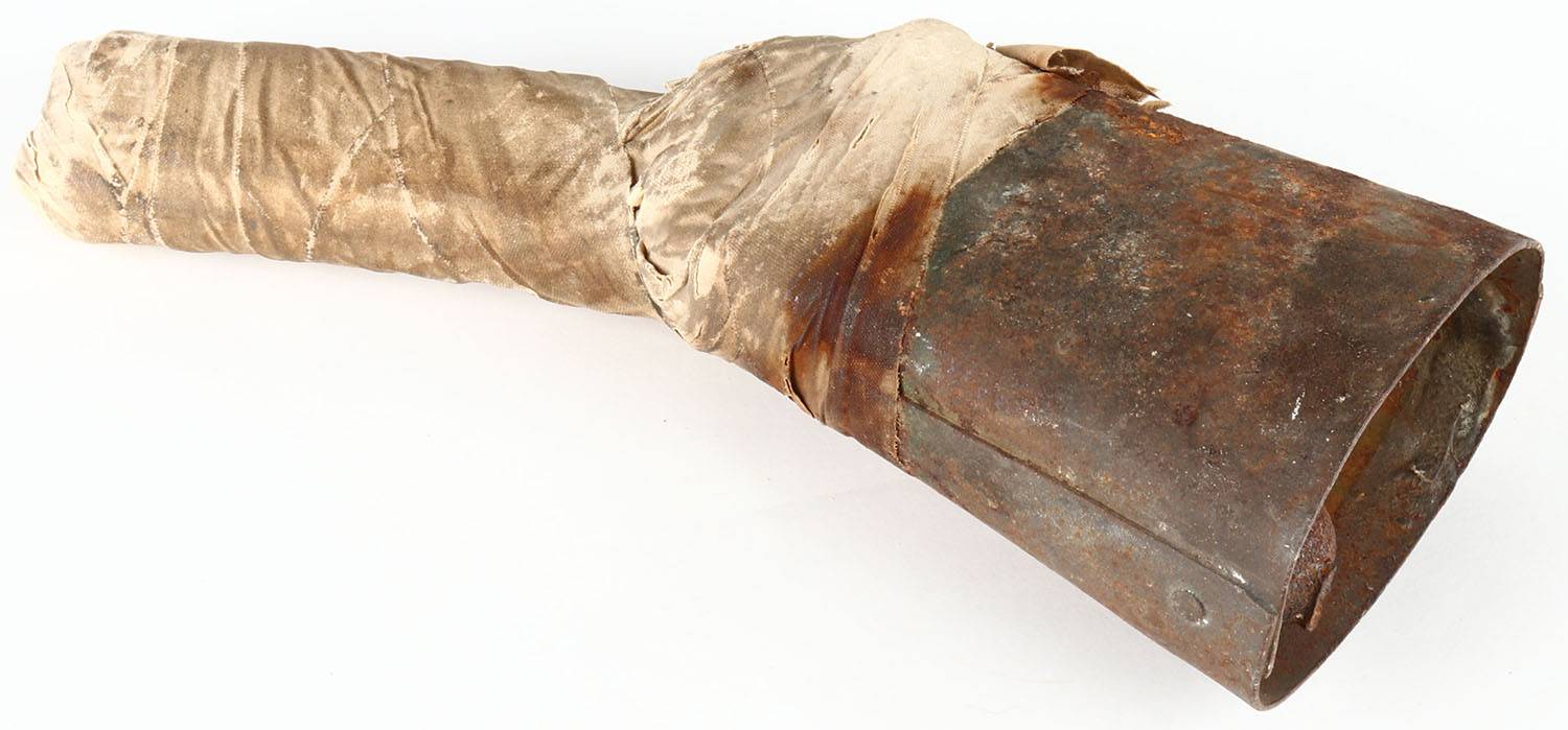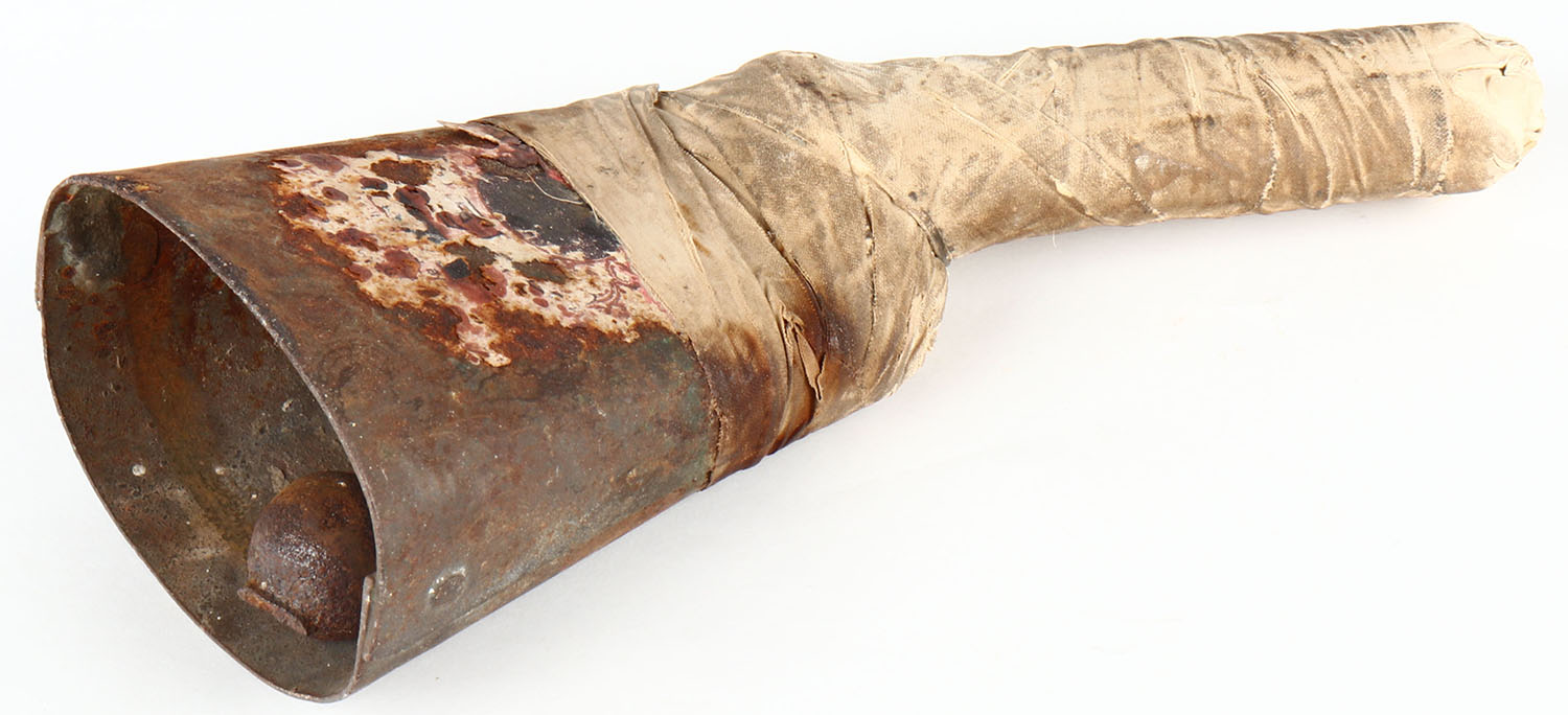 Plains Indian Blackfoot Indian Rare and one of a kind medicne rattle made from a cow or sheep bell and attached handle wrapped in early trade ribbon about 1890 would have been used for healing and prayer - Value: 10 to 600