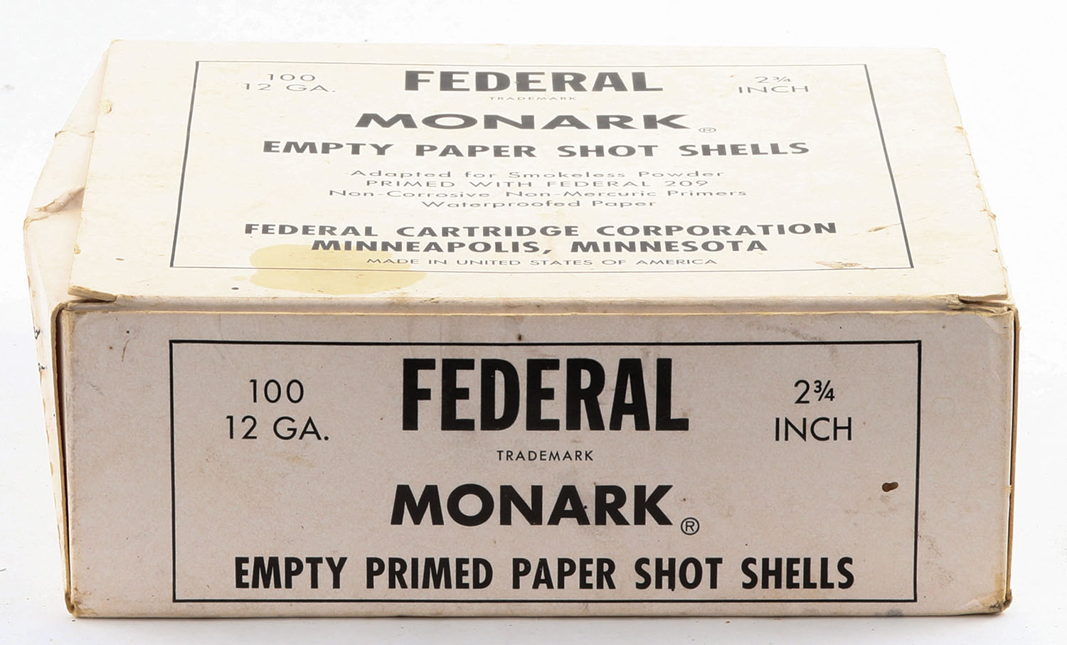 Federal, Monark, 12ga, 1pc., Partial 67rds of NPE, 2 3/4'', white box with black text, box has edge wear & light scuffing. Paper shells are excellent. Grade: Very Good ++ - Value: 40 to 200