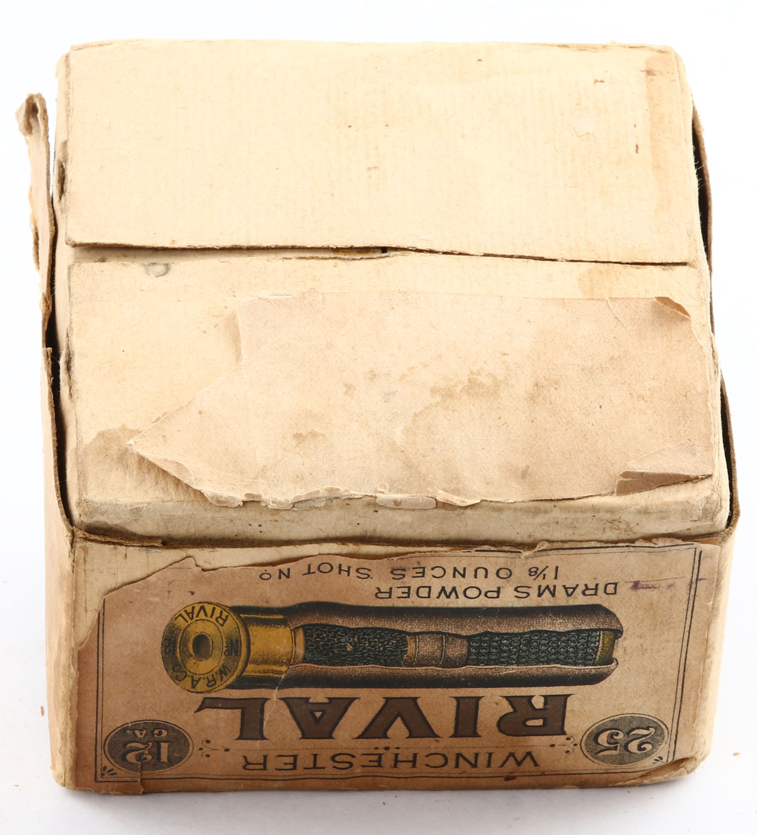 RARE!!! Winchester, RIVAL, 12ga., 2pc., Partial 24rds of fired paper shells, buff box with buff & brown label, has rare CUT-A-WAY shot shell on side, box has age soiling & scuffing with edge wear, has a tear to seam, label is 90% intact, paper shells are fair. HARD TO FIND BOX! Grade: Very Good - Value: 200 to 800