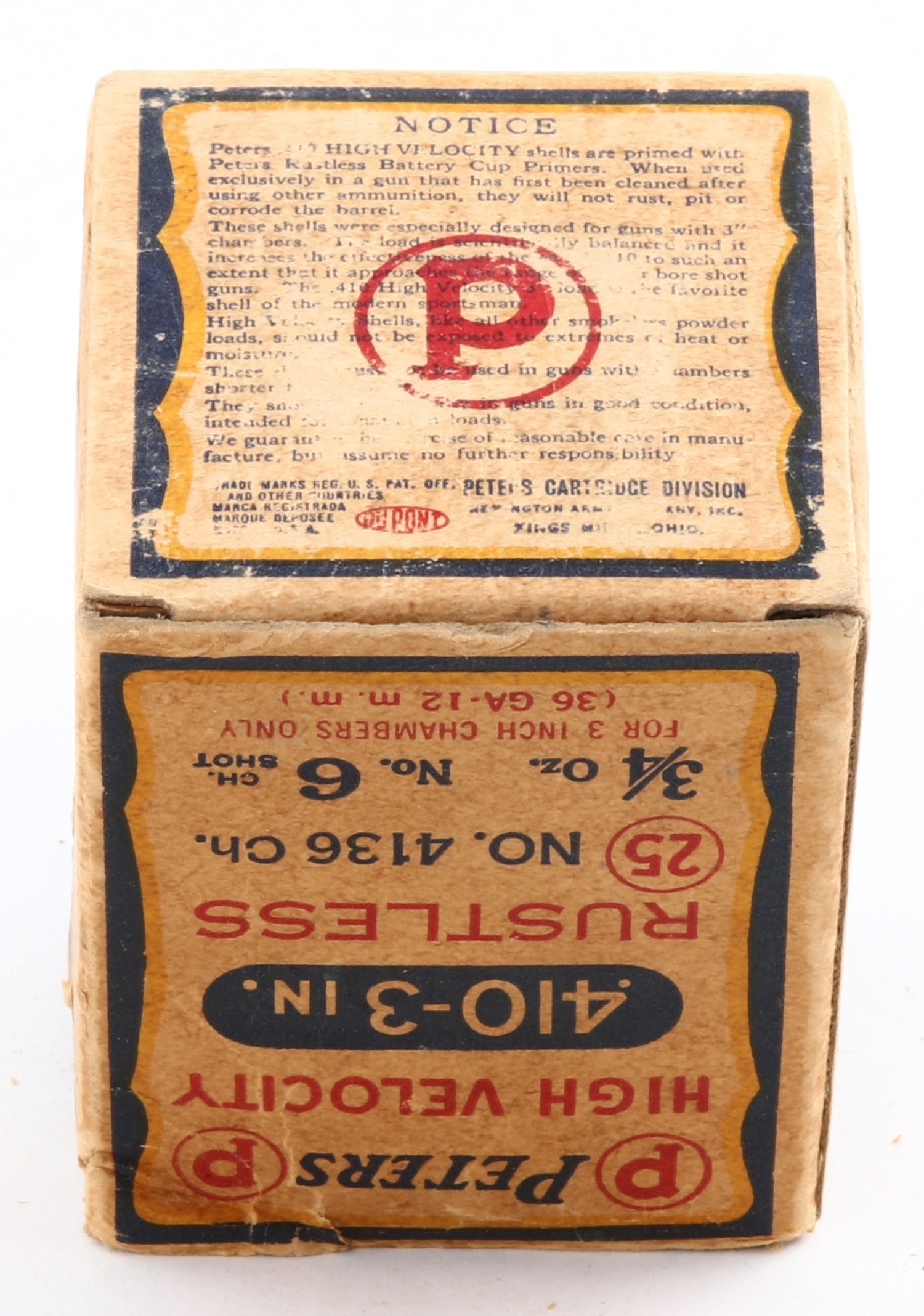 Peters Cart., High Velocity, 410ga., 3'', 1pc., Partial 18rds, shot size 6 CH, multi colored box that pictures mallard flying out of the marsh grass, No Duvrock sides, box has scuffing with edge wear, inside folding flaps are torn, has a seam split to top flap, paper shells are excellent, VERY RARE! Grade: Very Good - Value: 200 to 600