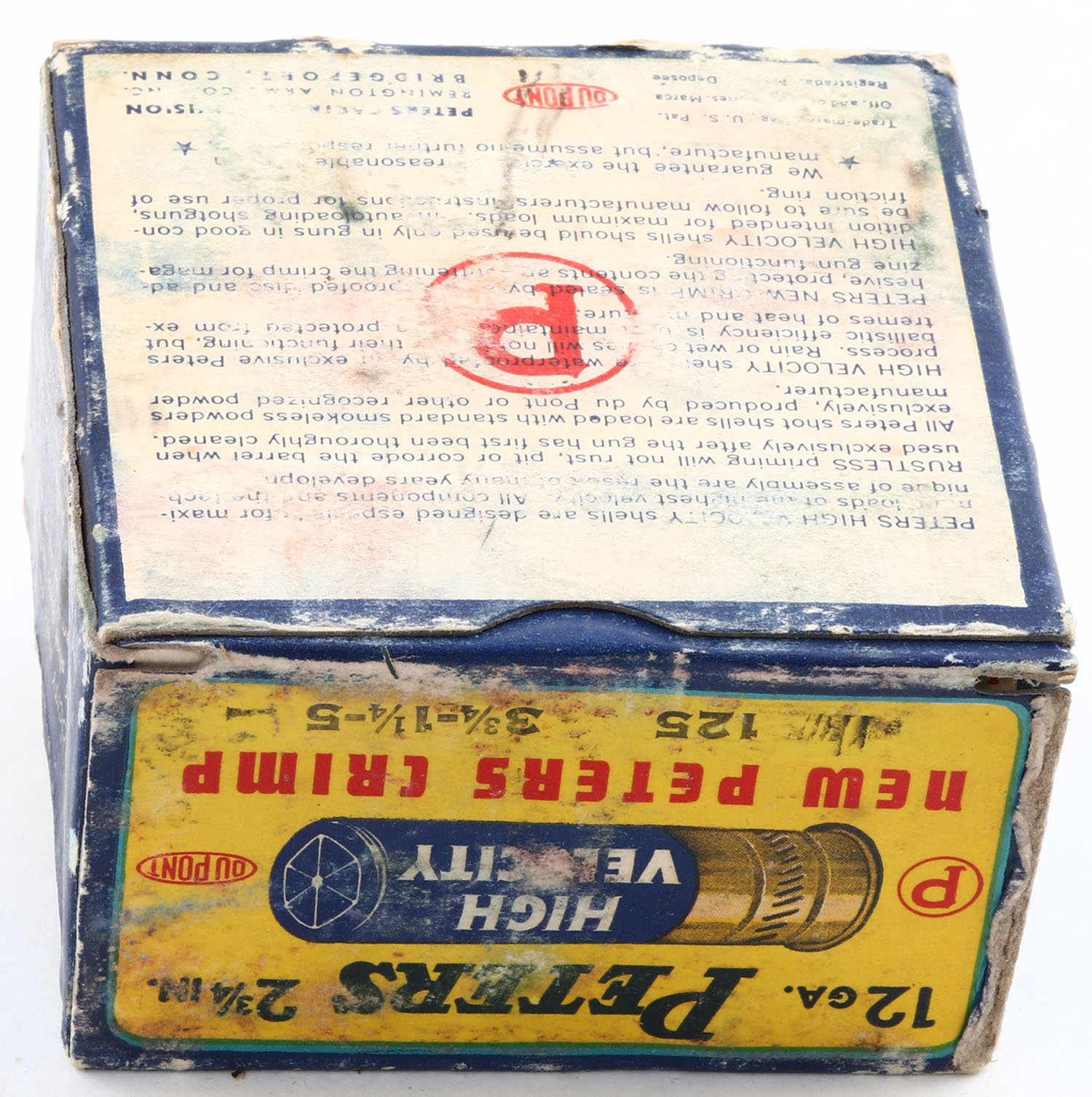 Peters Cart. Div., High Velocity, New Peters Crimp, 12ga., 2 3/4'', 1pc., Full, shot size 5, multi colored box that pictures mallard flying out of the marsh grass, box has scuffing & edge wear, paper shells are excellent. Grade: Good ++ - Value: 20 to 60