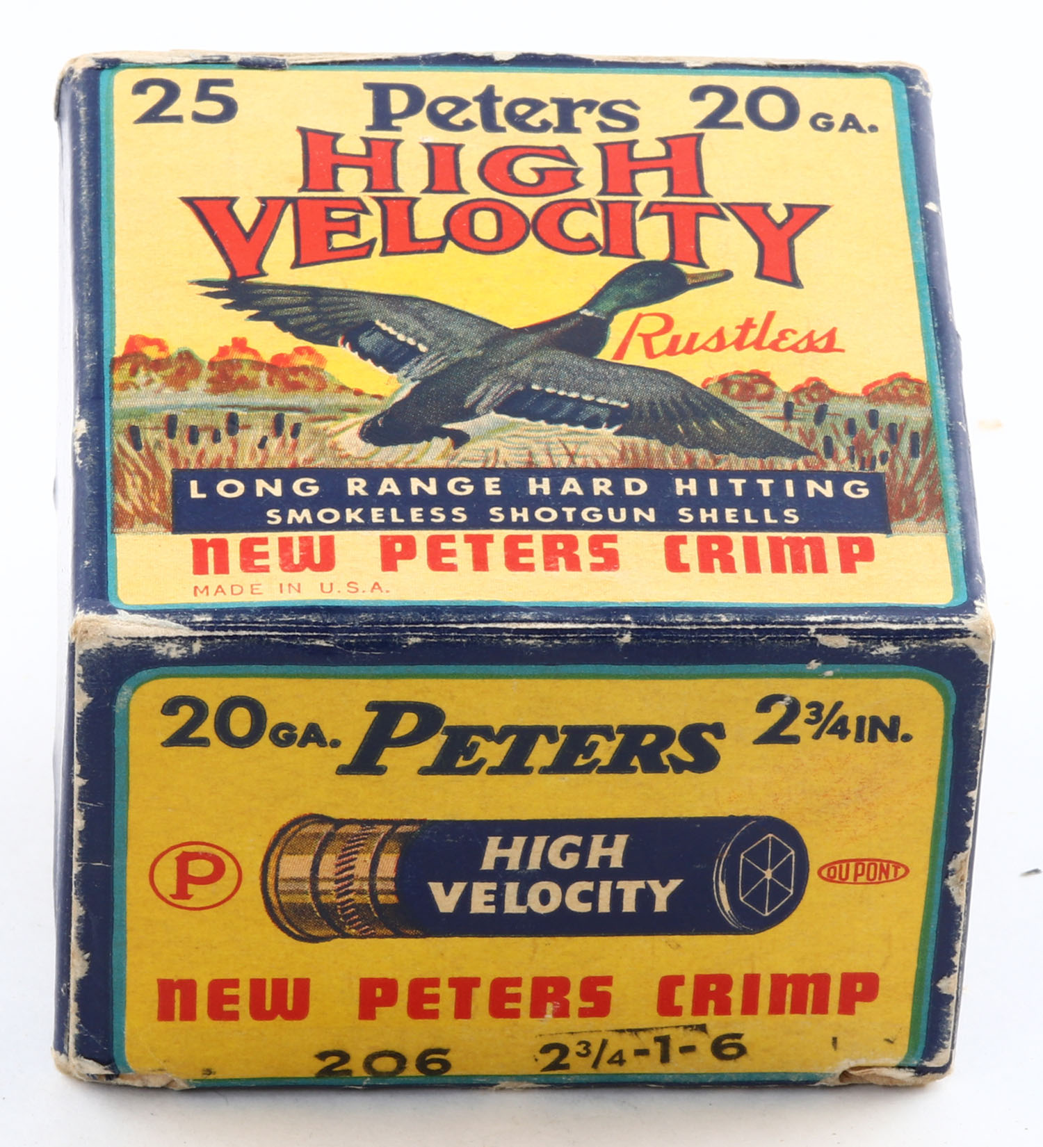 Peters Cart. Co., High Velocity, New Peters Crimp, 20ga., 1pc., Full, shot size 6, 2 3/4'', multi colored box that pictures mallard flying out of the marsh grass, box is solid with edge & corner wear, paper shells are excellent. Grade: Very Good ++ - Value: 20 to 60