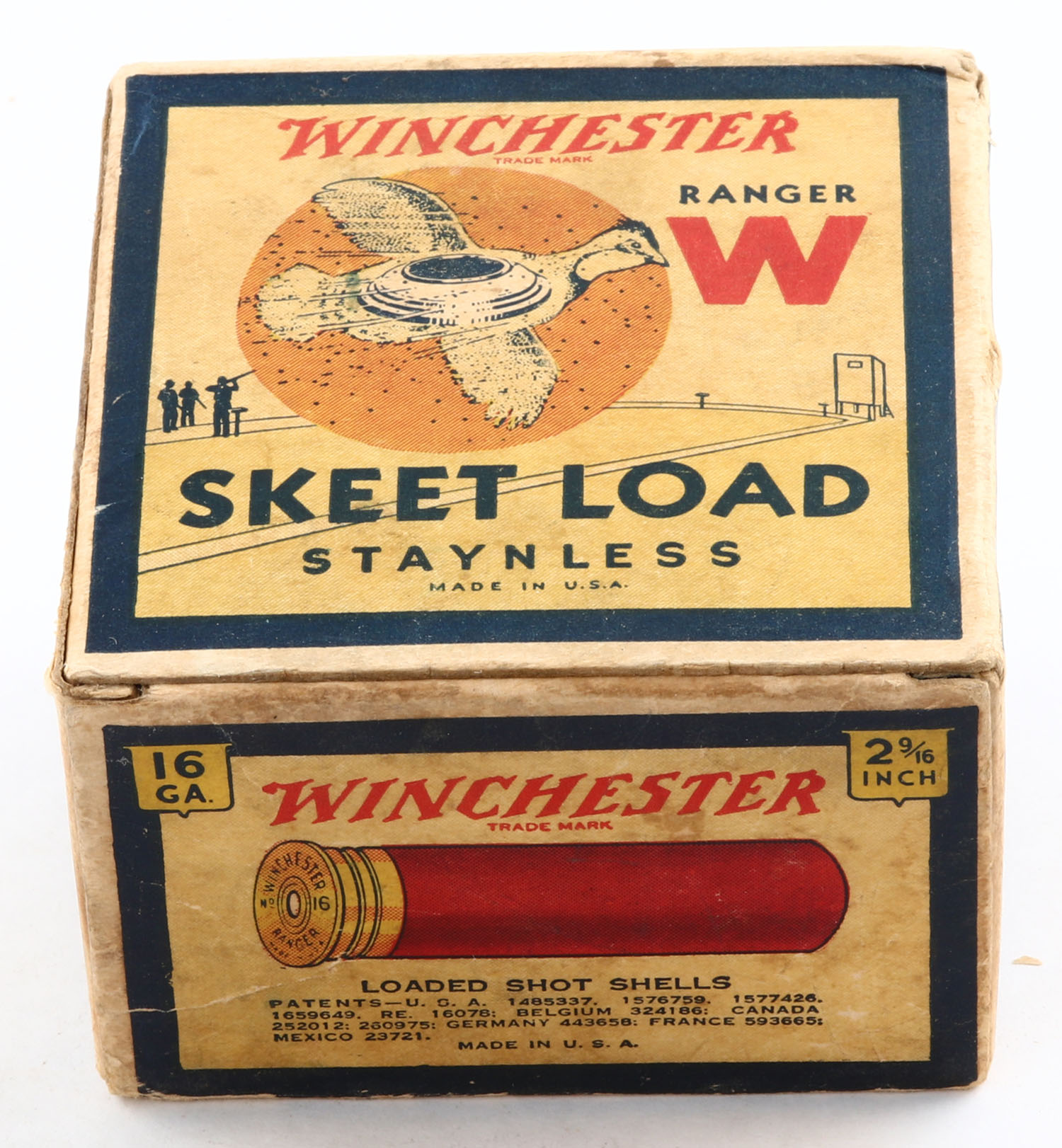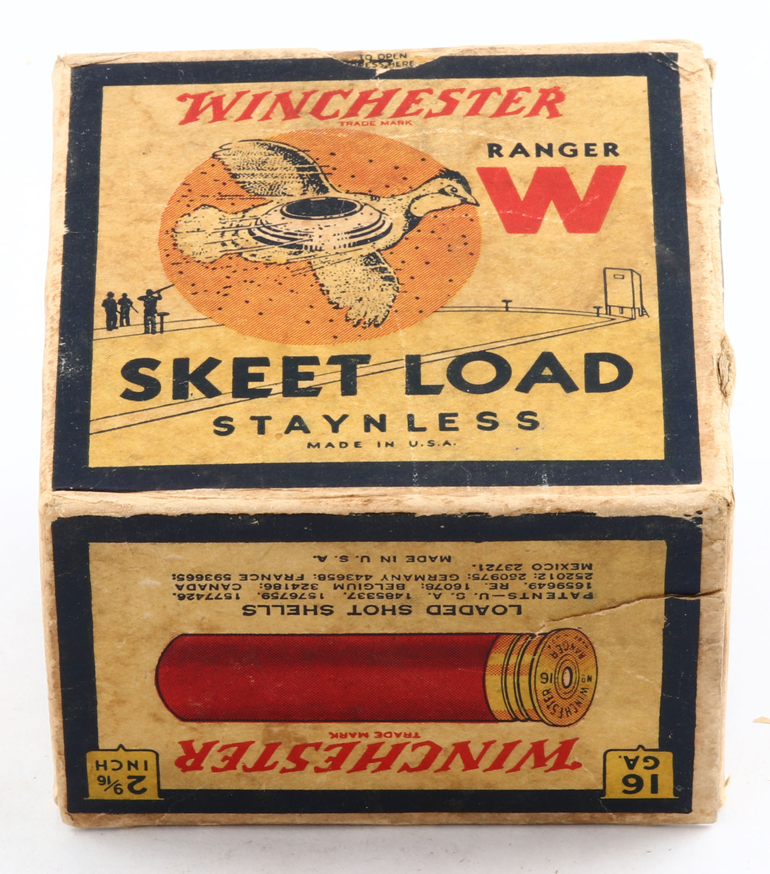 Winchester, RANGER SKEET LOAD, 16 GAUGE!, 1pc., Full with 22rds being correct shot, White, black & red box that pictures flying Quail with skeet in body & shot all around, Staynless, 2 9/16'', Loading: Hercules Red Dot, 2 1/2 Drams 1 Oz. No. 9 Chilled Shot, Box is solid with small shell protrusion & light soiling, EXTREMELY RARE BOX & this one is harder to find in 16ga than 28ga, paper shells are excellent. Grade: Very Good ++ - Value: 200 to 800
