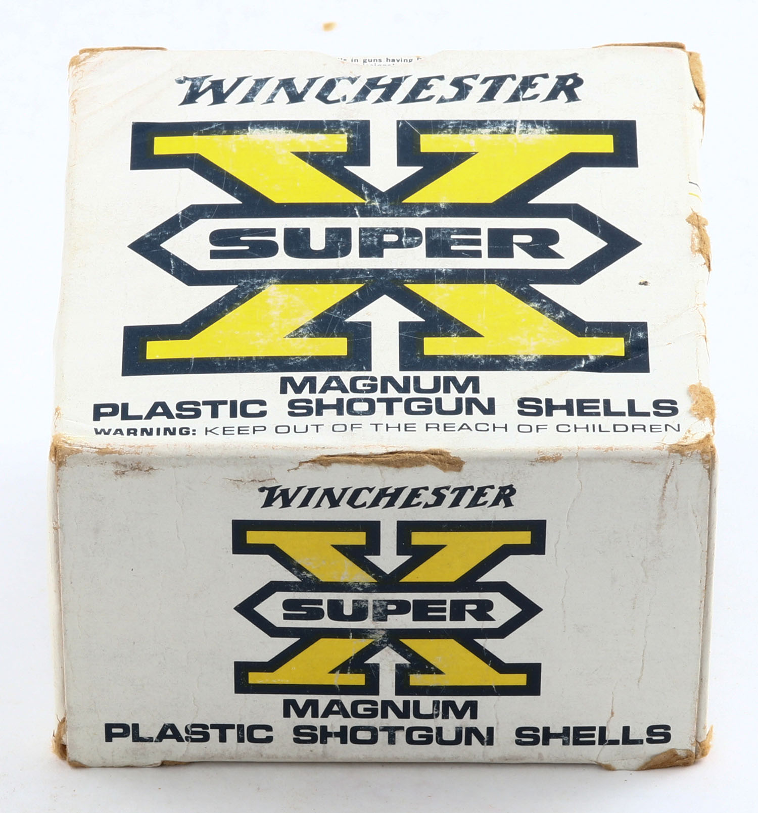 Winchester, Super X, Magnum, 12ga., 1pc., Full, shot size 2, yellow, blue and white box, box has edge & corner wear with great colors, plastic shells are excellent. Grade: Very Good ++ - Value: 10 to 40