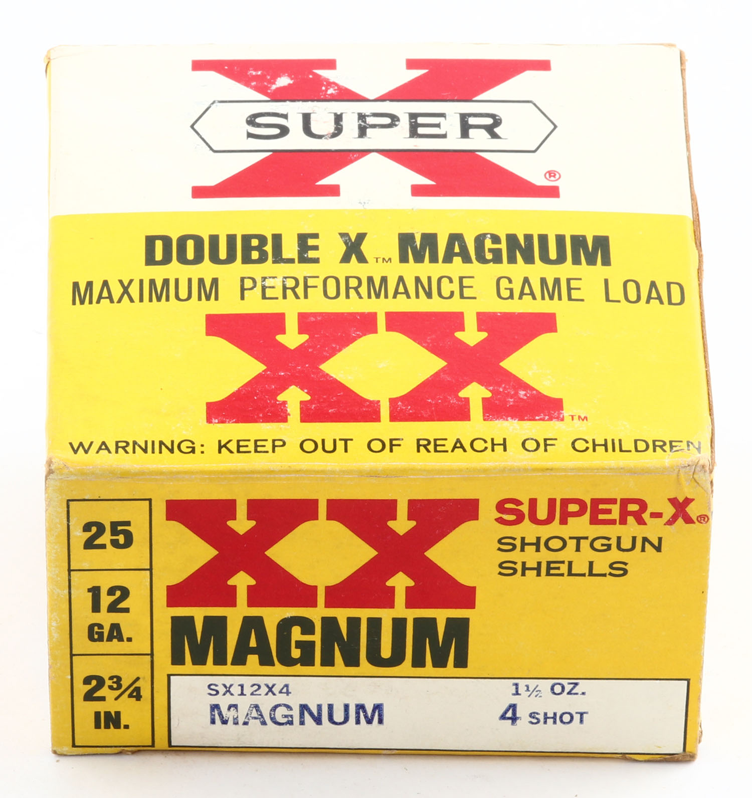 Winchester, Super X, Double X Magnum, 12ga, 1pc., Full, multi-colored box, shot size 4 Magnum, box is very solid with excellent colors, plastic shells are excellent. Grade: Excellent + - Value: 20 to 50