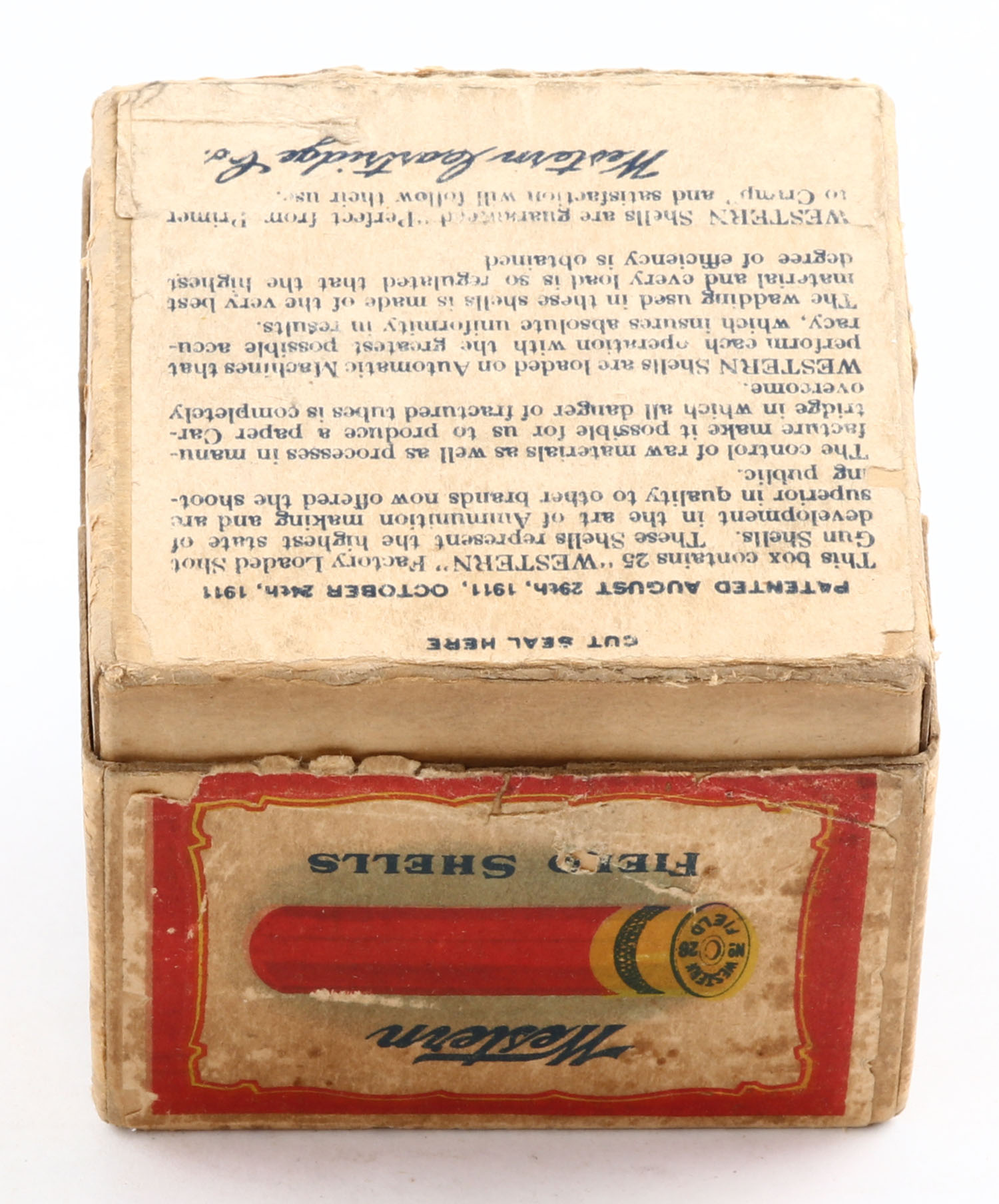 Early Western, Field, 28ga., 2pc, Full, shot size 8 CH, box has light age soiling with some scuffing & edge wear, paper shells are very good. Grade: Very Good ++ - Value: 100 to 500