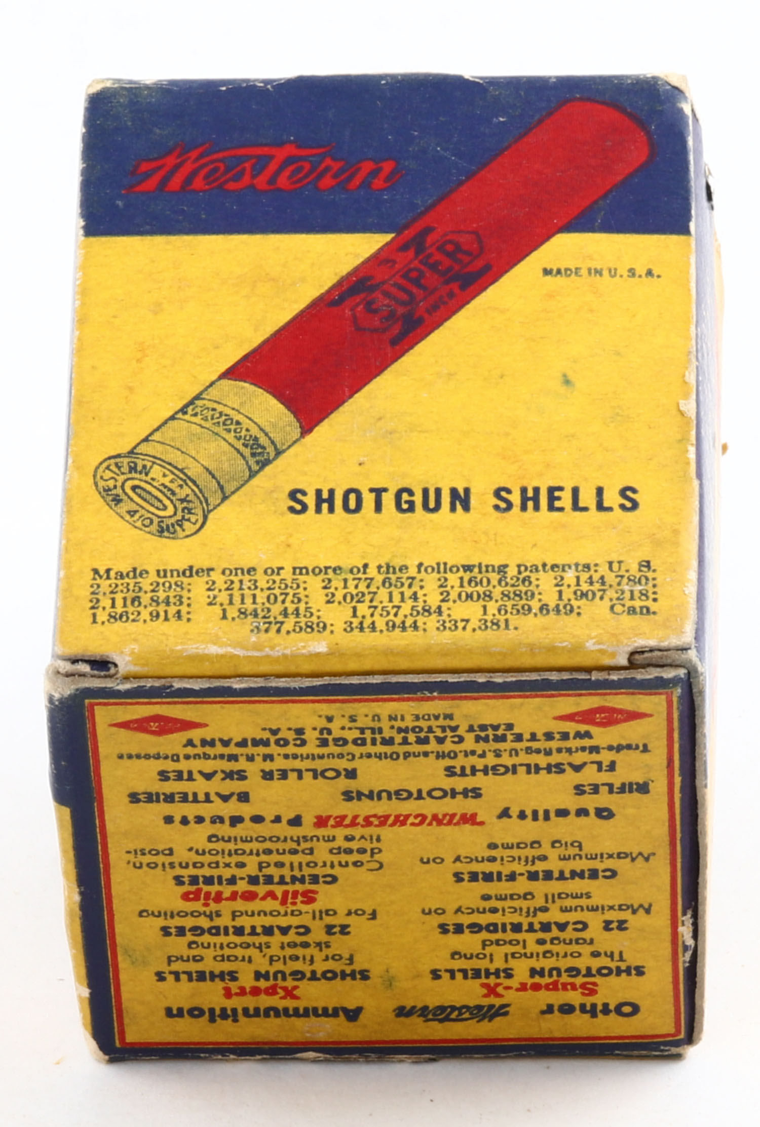 Western, Super X, 410ga., 3'', 1pc., Full, shot size 6, multi-colored box, box has a seam split with some age soiling, paper shells are excellent. Grade: Very Good + - Value: 10 to 30