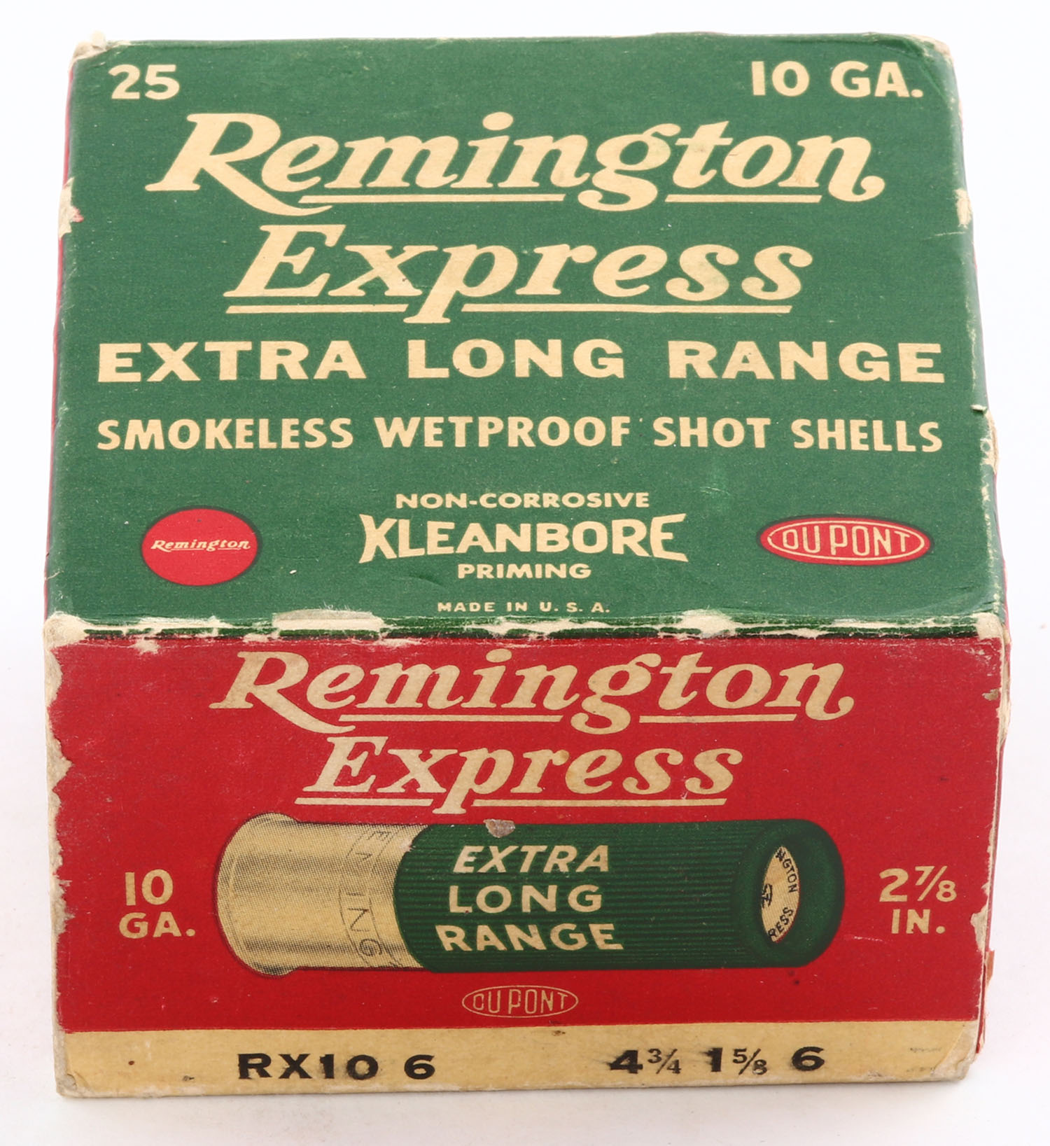 Remington, Express Extra Long Range, 10ga., 1pc., Full, shot size 6, red and green box, 2 7/8'', box is solid with edge wear, paper shells are excellent. Grade: Excellent - Value: 40 to 100