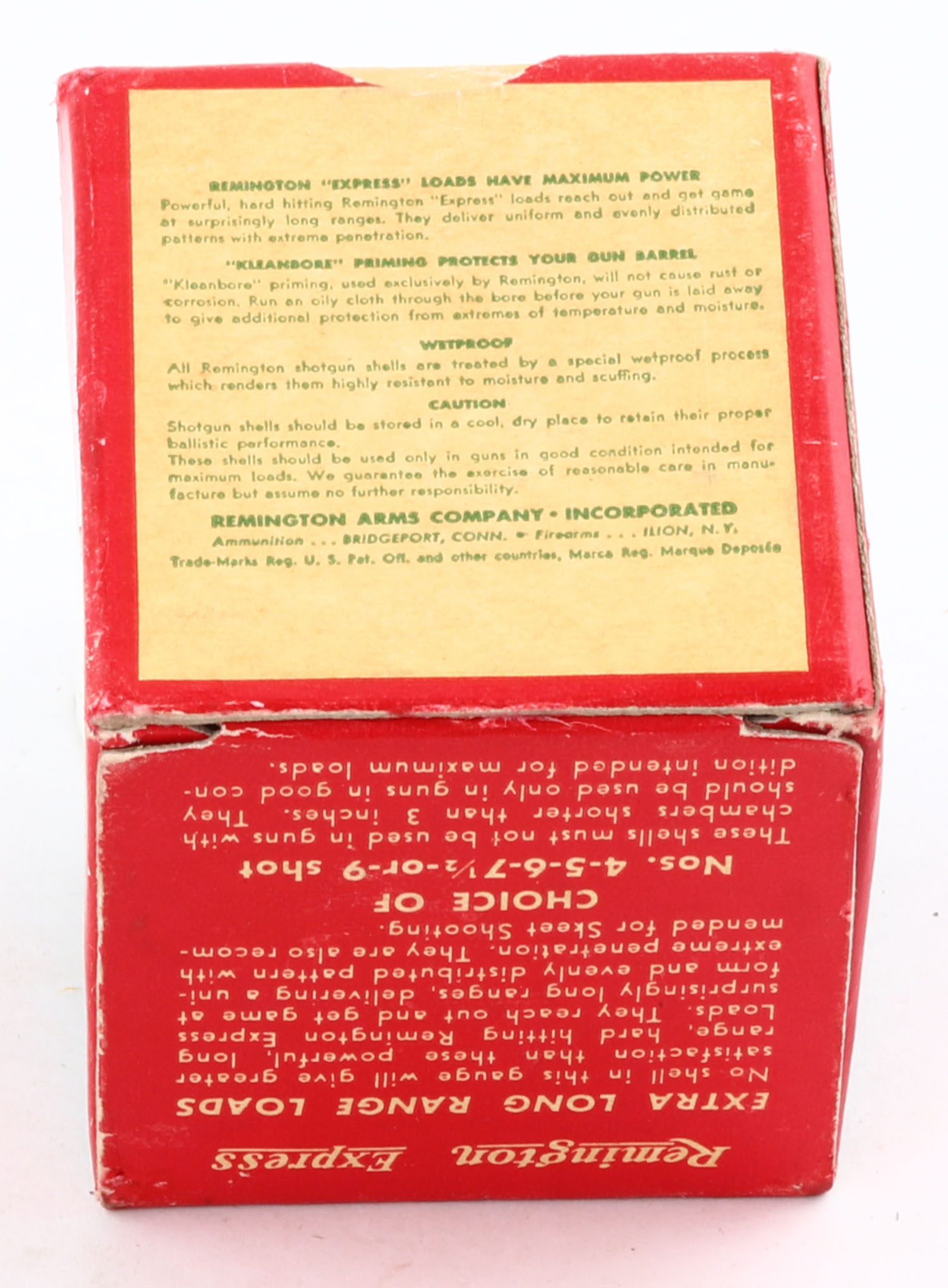 Remington Express, Extra Long Range, 410ga., 3'', 1pc., Full, shot size 6, box is white, yellow, red and green, box is very solid with excellent colors, paper shells are excellent. Grade: Excellent ++ - Value: 20 to 50
