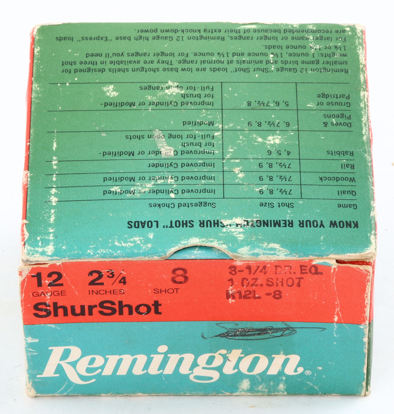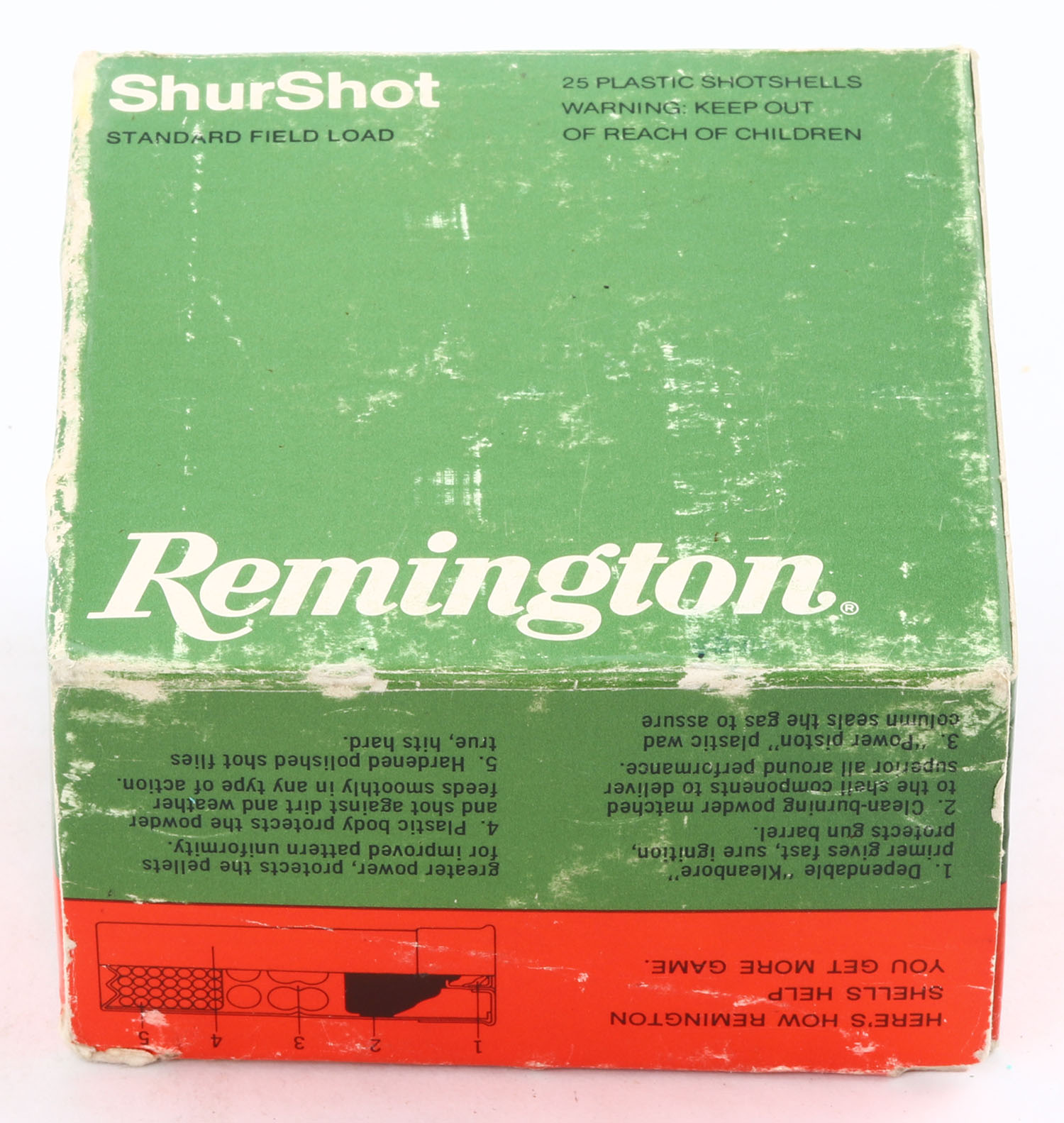 Remington, Shur Shot, 12ga., 2 3/4'', 1pc., Full, shot size 8, multi-colored box, box has age soiling & edge wear, plastic shells are excellent. Grade: Very Good - Value: 10 to 30