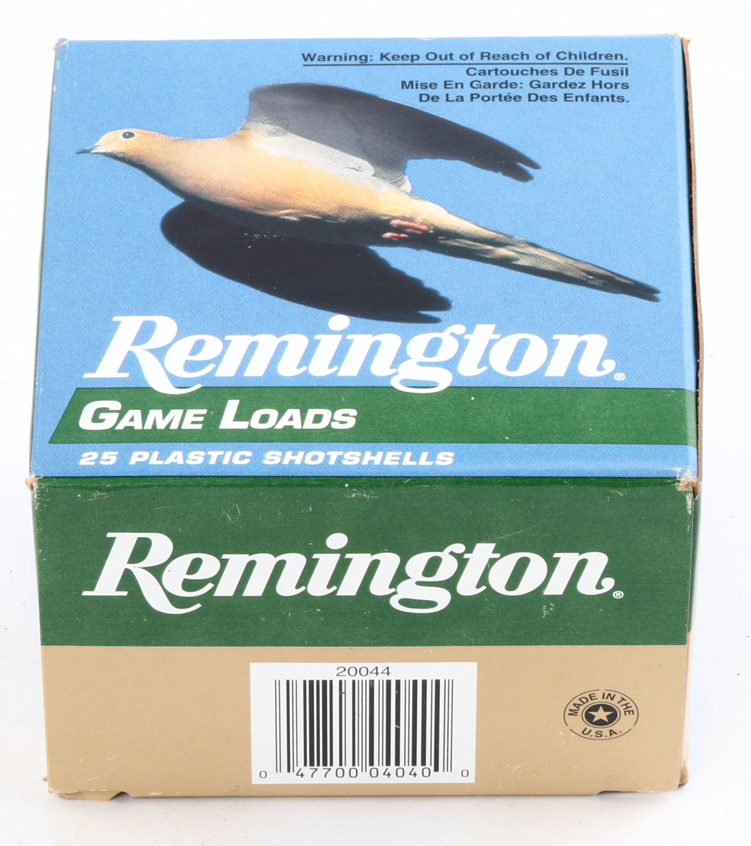 Remington Game Loads, 20ga., 2 3/4'', 1pc., Full, shot size 8, multi-colored box, box is very solid with great colors, plastic shells are excellent. Grade: Excellent ++ - Value: 10 to 30