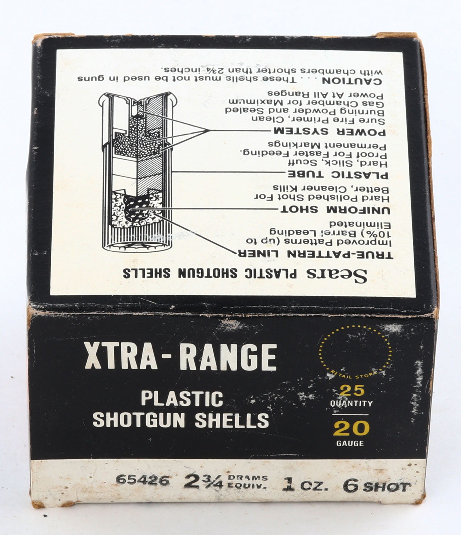 Sears, Xtra-Range, 20ga., 1pc., Full, shot size 6, multi-colored box, box is solid, plastic shells are excellent. Grade: Very Good - Value: 10 to 40