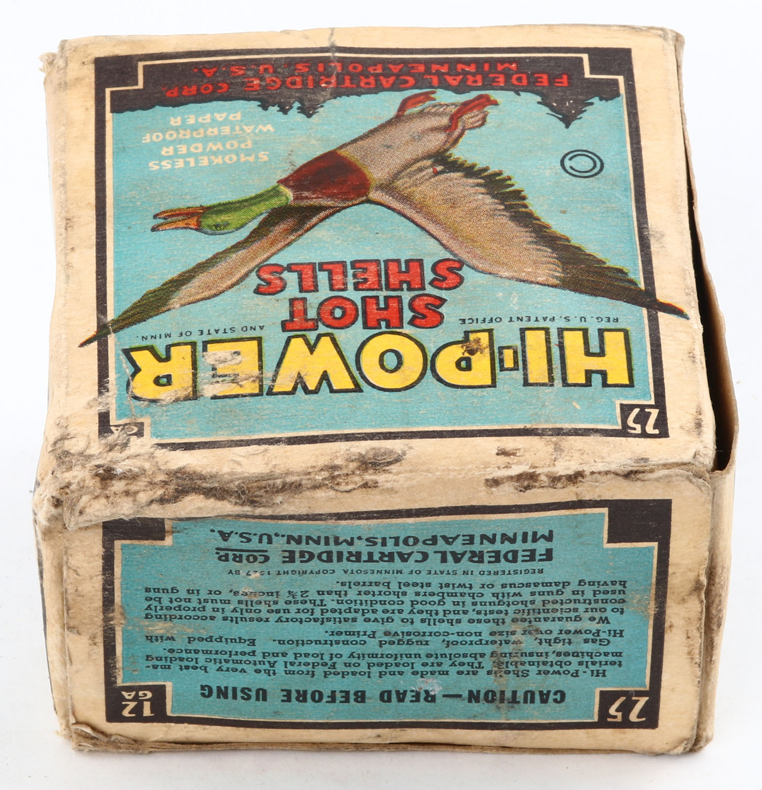 Federal Cart. Co., HI-POWER, 12ga., 1pc., Partial 18rds, shot size 2, Black border, blue, yellow and red box with flying mallard, box has age soiling with edge wear & scuffing, paper shells are excellent. Grade: Good - Value: 10 to 20
