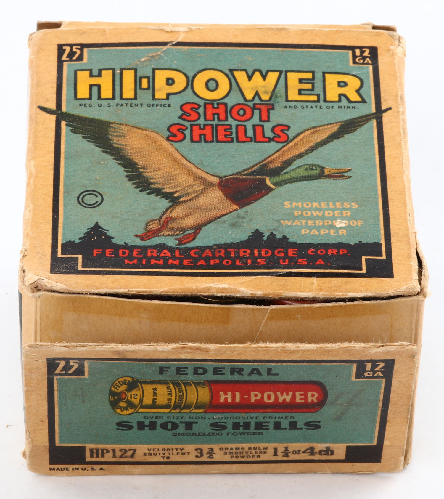 Federal Cart. Co., HI-POWER, 12ga., 1pc., Partial 11 Rds., shot size 4 CH, Black border, blue, yellow and red box with flying mallard, box has soiling with a partial seam split, light edge wear with very nice colors, paper shells are very good. Grade: Very Good - Value: 10 to 20