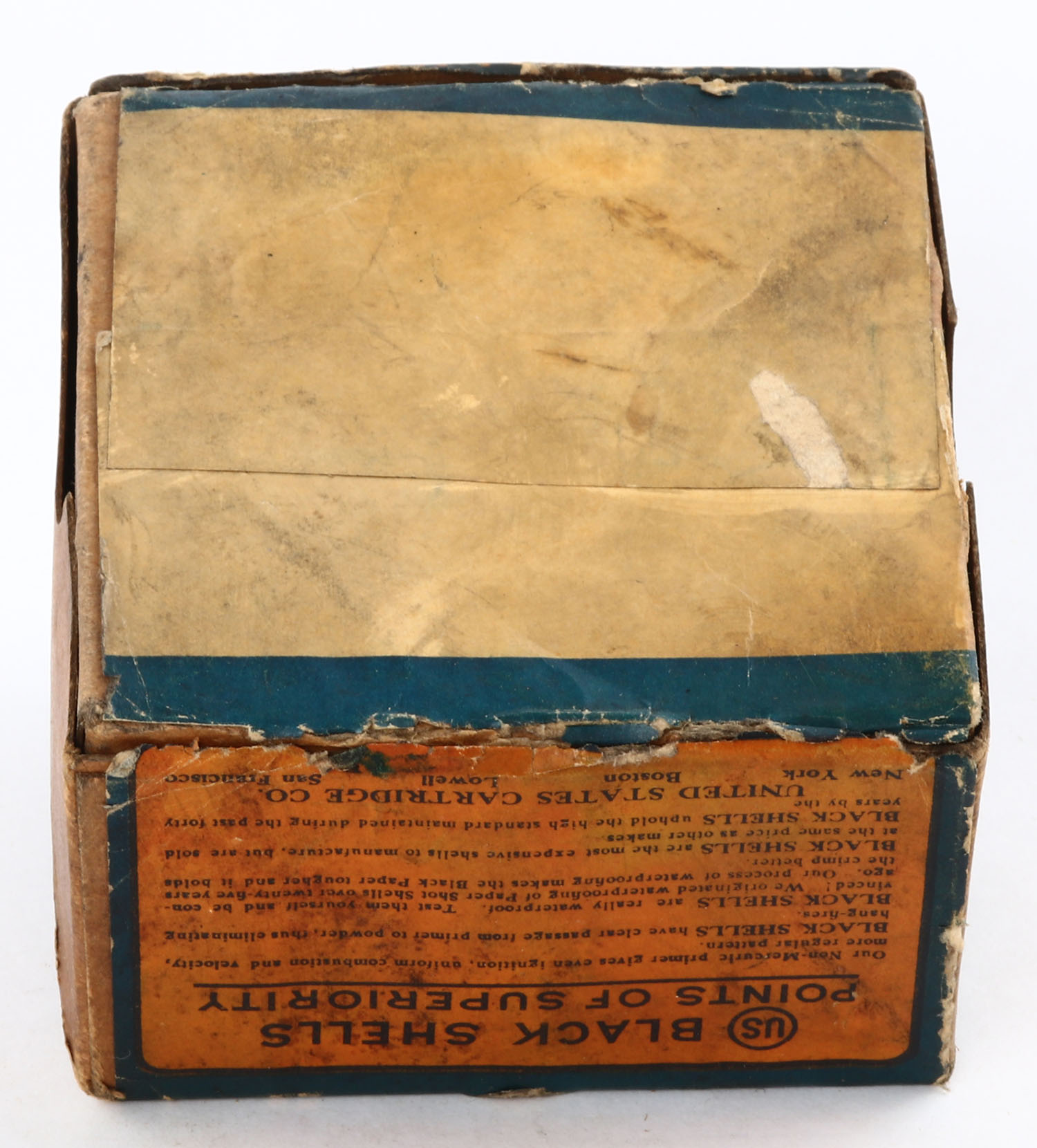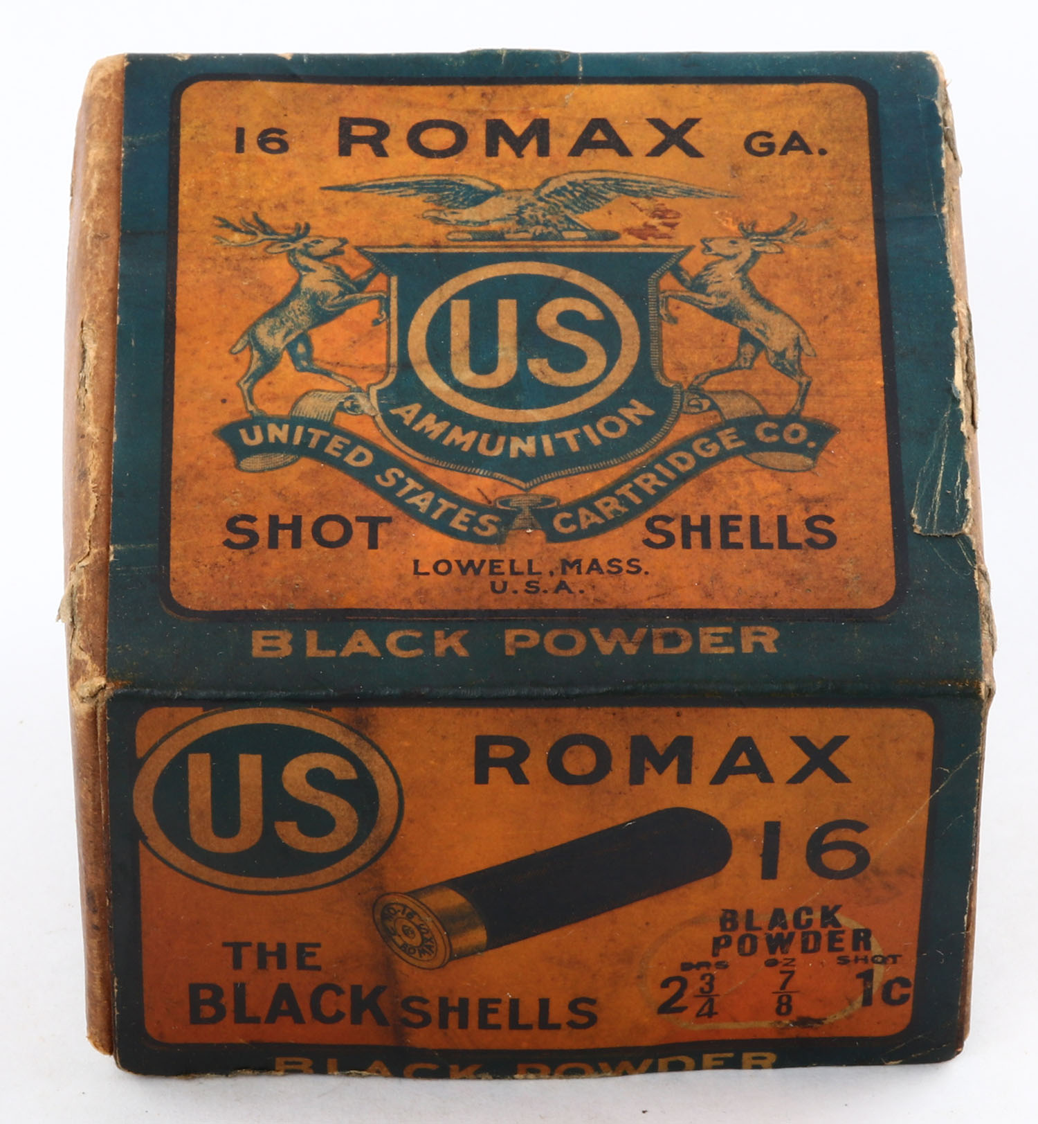 US Cart. Co., Lowell, Mass, Romax, 16ga, 2pc., Empty, shot size 1C, buff box orange, blue & white label, box has age soiling & edge wear with some scuffing. Grade: Very Good - Value: 20 to 80