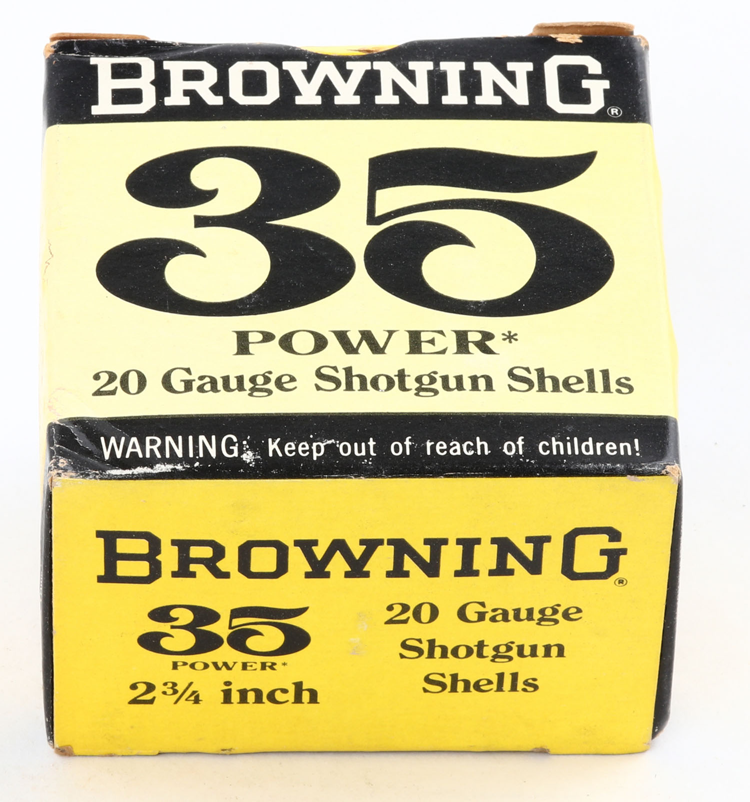 Browning, 35 Power, 20ga., 2 3/4'', 1pc., Full, shot size 9, black, yellow & white box, box is very solid with great color, has a partial tear to top flap, paper shells are excellent. Grade: Excellent - Value: 20 to 60