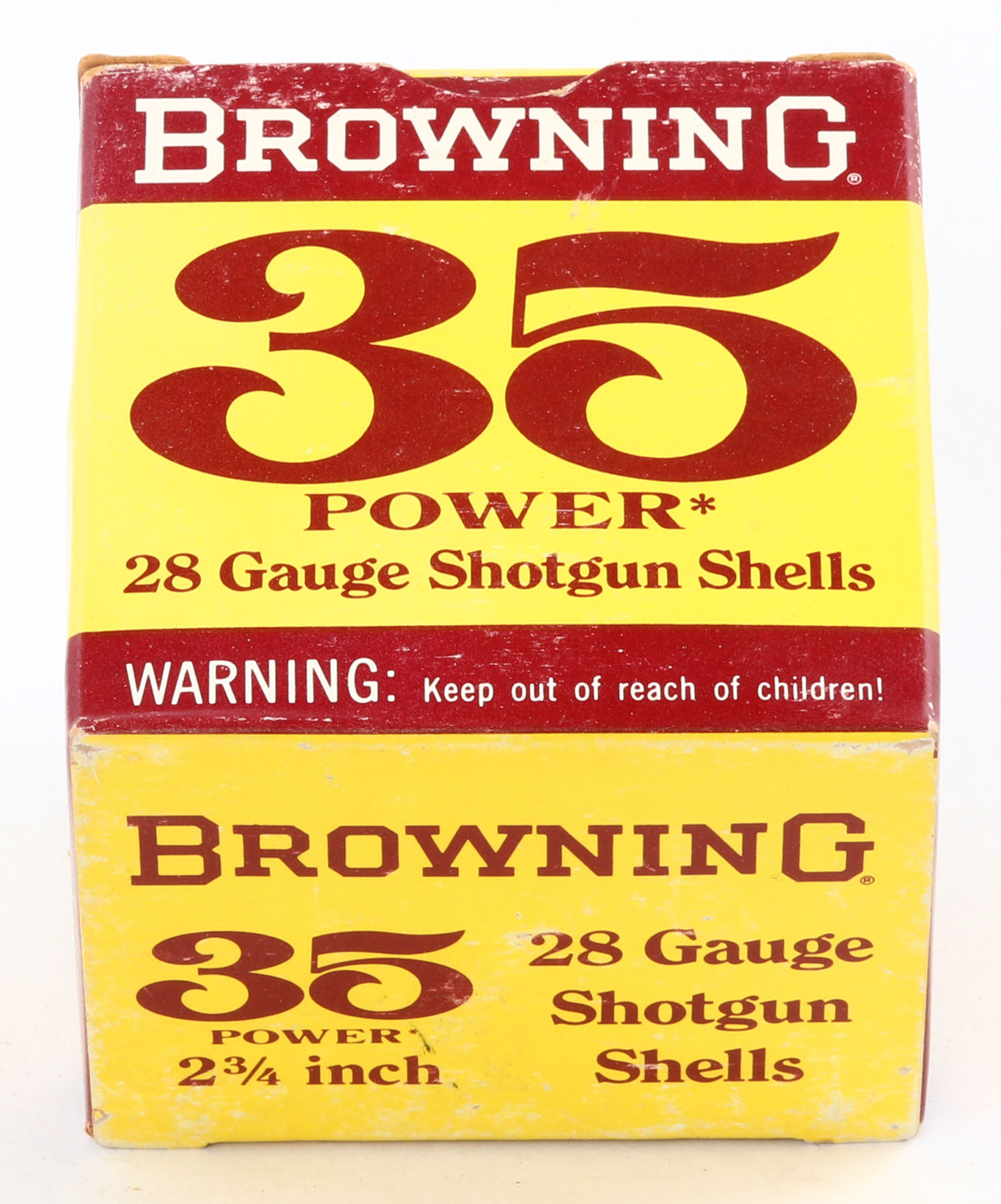 Browning, 35 Power, 28ga., 2 3/4'', 1pc., Full, shot size 6, maroon, yellow & white box, box is very solid with great color, paper shells are excellent. Grade: Excellent + - Value: 20 to 60