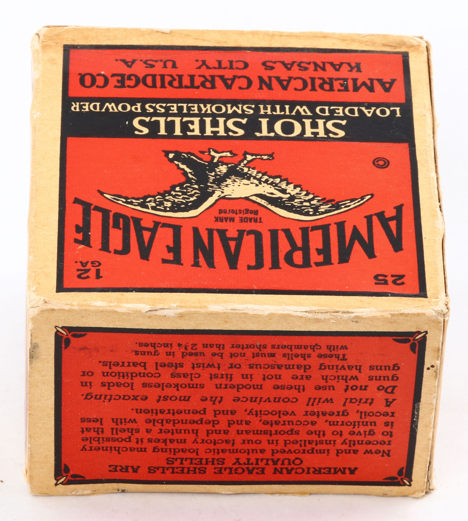 American Cart. Co., A-Grade, 12ga., 1pc., Full, shot size 4ch, buff, red & black box that pictures a flying eagle, box has edge & corner wear with great colors, paper shells are excellent. Grade: Excellent - Value: 40 to 100
