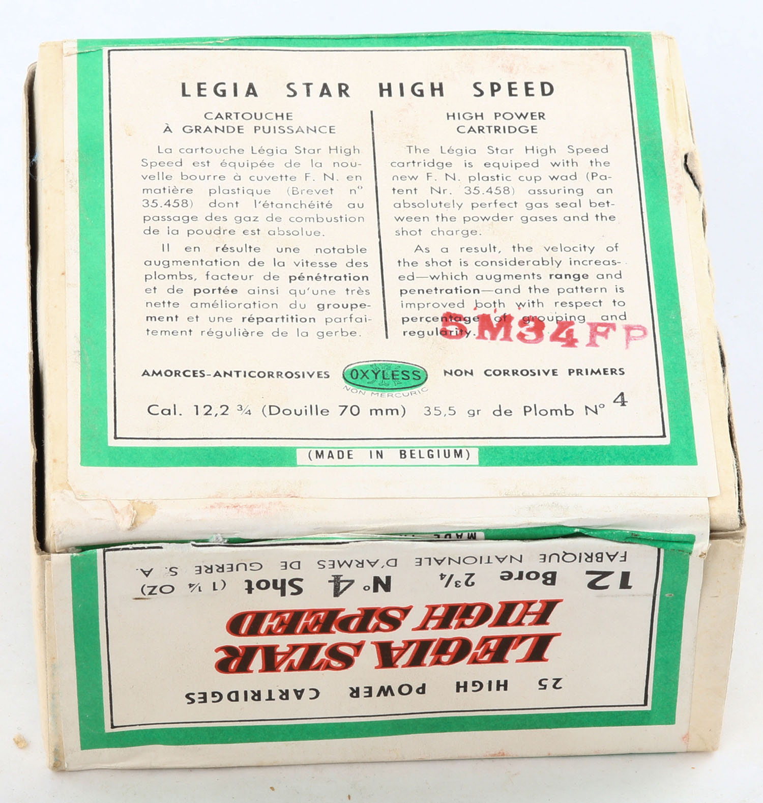Legia Star, High Speed, 12ga., 2pc., Empty has Insert, 2 3/4'', shot size 4, white box with multi-colored label, box and label are very solid, Made in Belgium. Grade: Excellent ++ - Value: 20 to 200