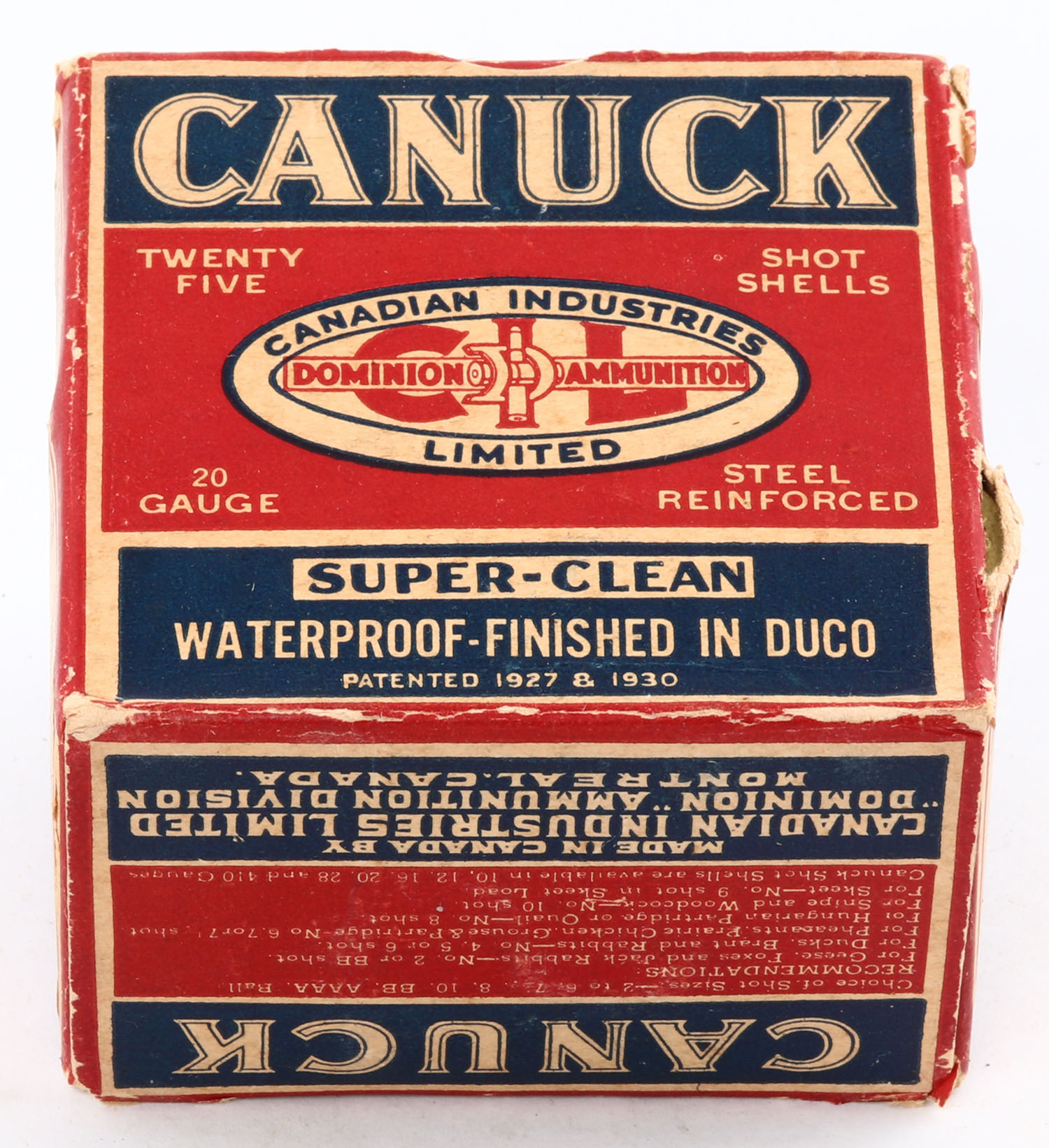 CIL, Canuck, 20ga., 1pc., Full, shot size 6CH, multi-colored box, box has edge wear with some shell protrusion, paper shells are excellent. Grade: Very Good + - Value: 10 to 40