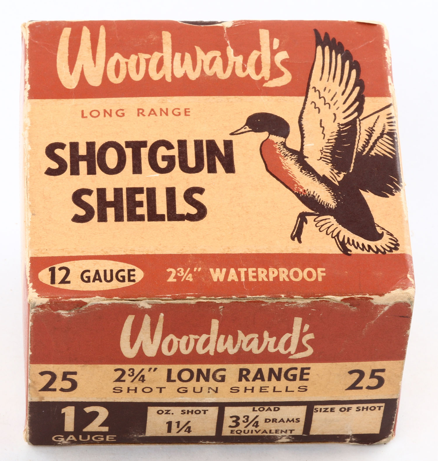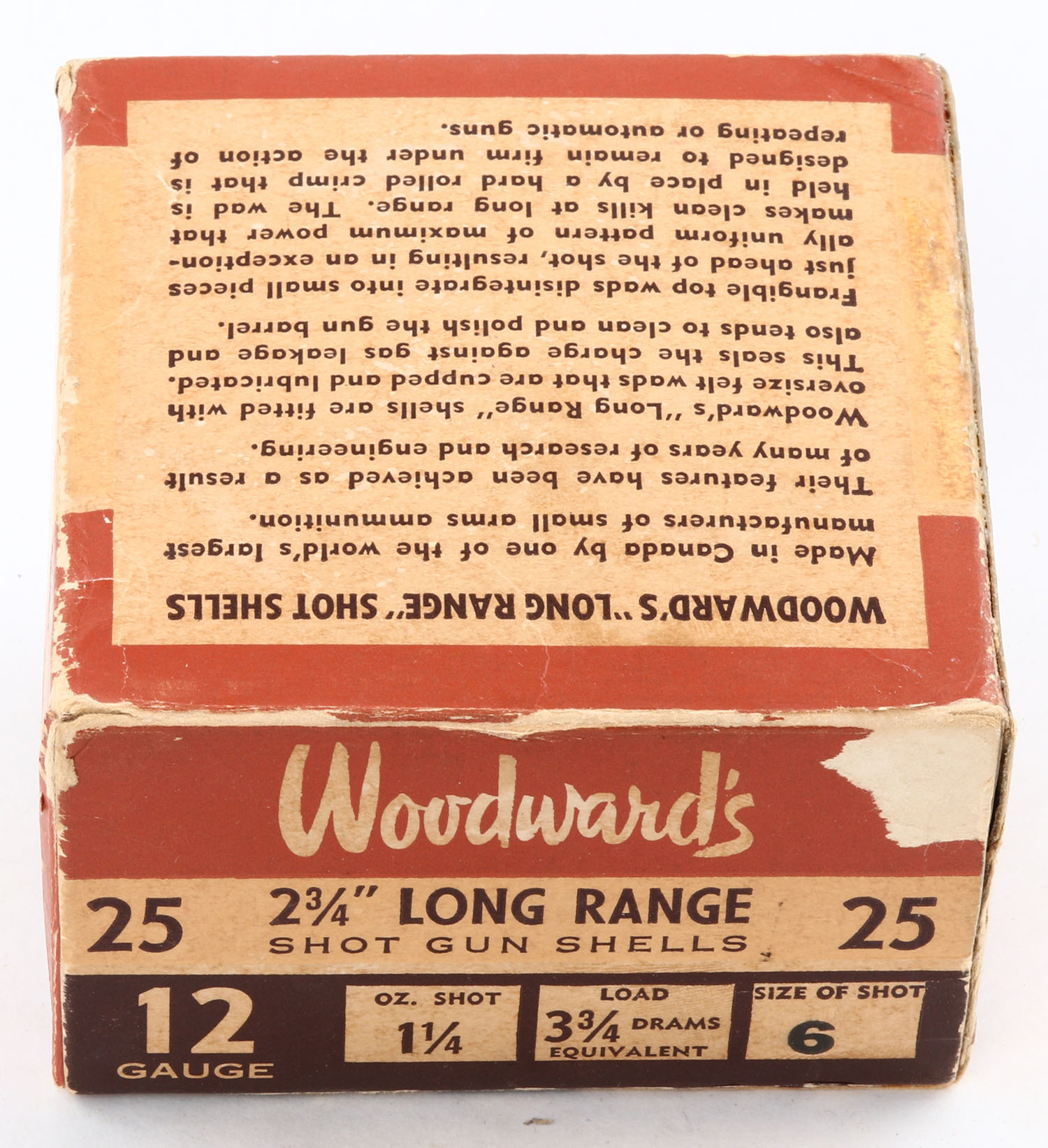Woodward's, Long Range, 12ga., 1pc., Empty, shot size unknown, multi-colored box, box has some scuffing with edge wear. Grade: Very Good ++ - Value: 10 to 40