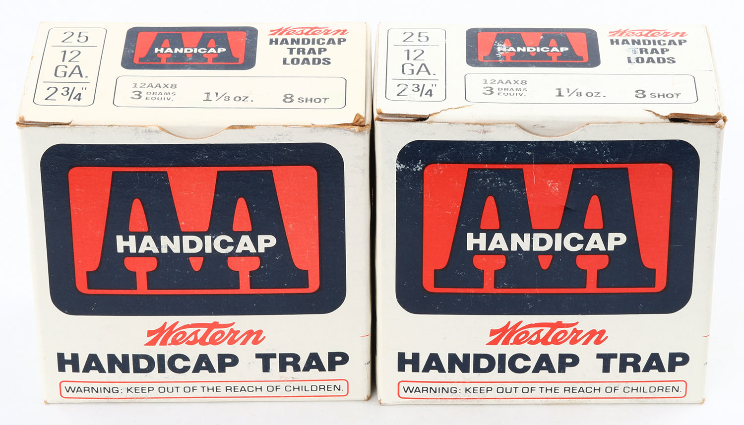 Lot of 2 Western, Double A Handicap Trap Loads, 12ga., 1pc., Appears Full, shot size 8, multi-colored boxes. Grade: Excellent - Value: 20 to 50