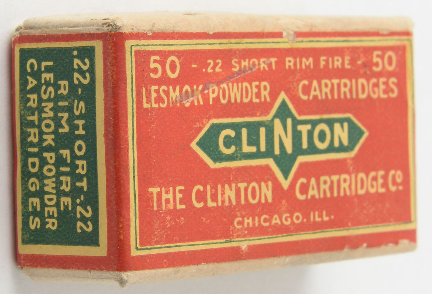 Clinton, Lesmok Powder Cartridges, .22 Short, RHWeb: CLINT-1 S-2.1a, FULL & SEALED, 2pc. Buff box with red wraparound label, box is solid with excellent color, very minor shelf & corner wear, edges are mostly crisp, label is intact. Grade: Excellent + - Value: 100 to 150