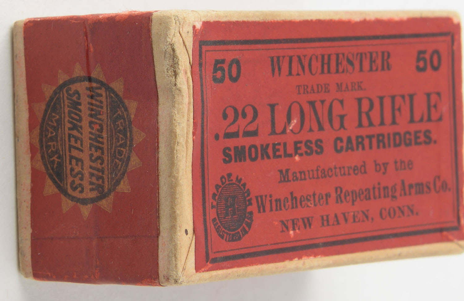 Winchester, Smokeless Cartridges, .22 Long Rifle, RR: WRA- 115 LR-12a, FULL & SEALED, 2pc. Buff box with red top & side sealing labels, box is solid with excellent color, very minor edge & corner wear, labels are intact. Grade: Excellent + - Value: 300 to 450