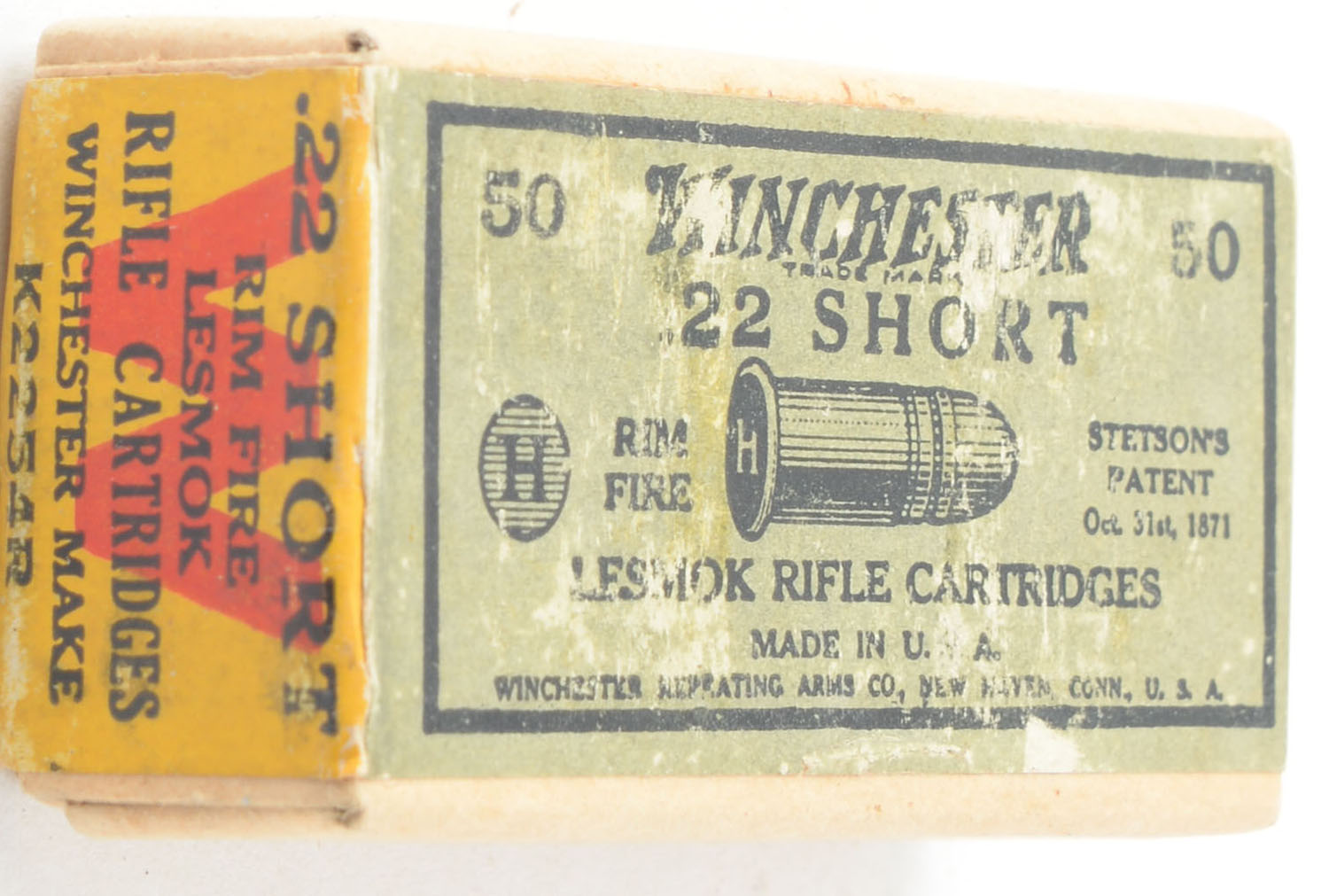 Winchester, Lesmok Rifle Cartridges, .22 Short, RR: WRA-177 S-65d, FULL & SEALED, 2pc. Buff box with green & yellow wraparound label, box is solid with excellent color, some shelf wear, corners are mostly sharp, edges are mostly crisp, label is intact. Grade: Excellent - Value: 50 to 75
