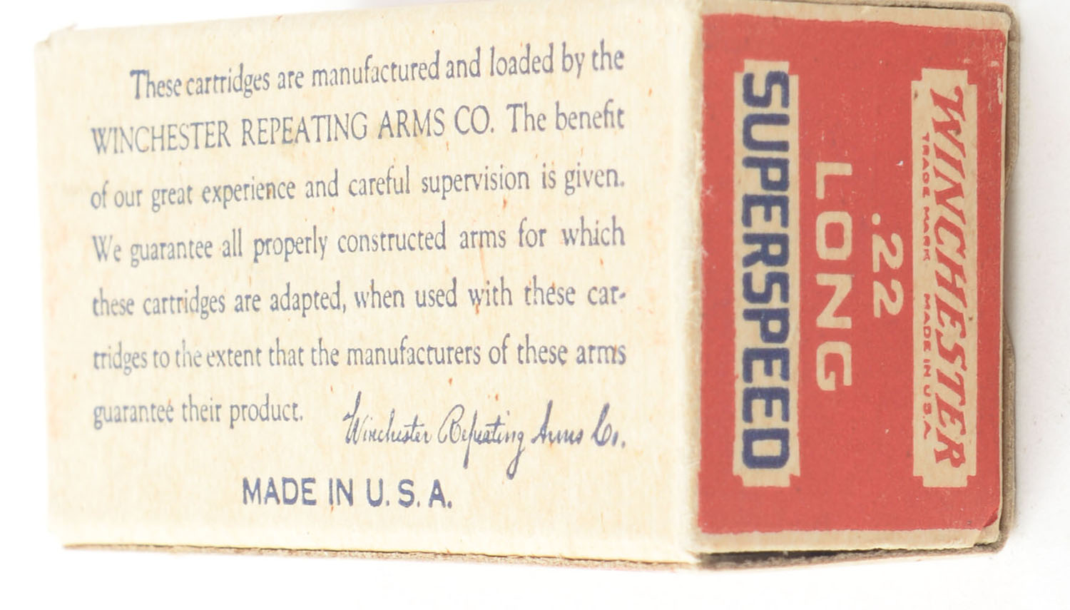 Winchester, Super Speed, .22 Long, Lead Bullets Greased, RHWeb: WRA-13 L-2b, Full, 1pc. Red white & blue box, box is solid with excellent color, very minor staining on top, corners are mostly sharp, edges are crisp, end flaps are solid, ammo is excellent. Grade: Excellent - Value: 200 to 300