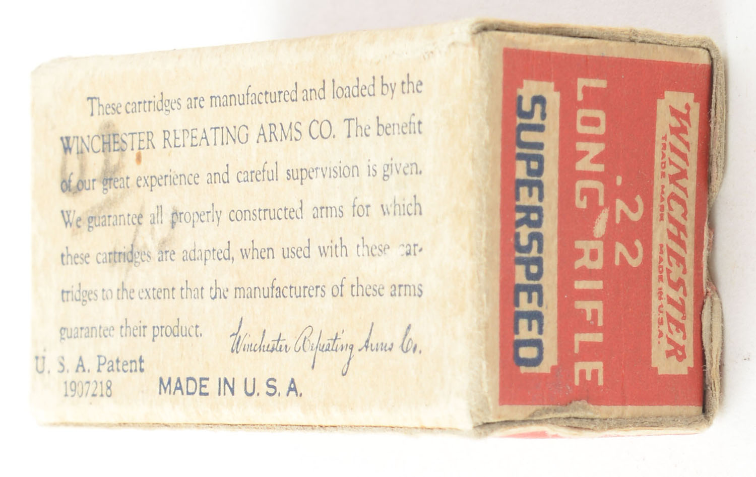 Winchester, Super Speed, .22 Long Rifle, RHWeb: WRA-13 LR-1c, Partial 25rds. 1pc. Red white & blue box, box is solid with excellent color, minor age soiling & corner wear, edges are crisp, end flaps are solid, ammo is excellent. Grade: Very Good ++ - Value: 20 to 30