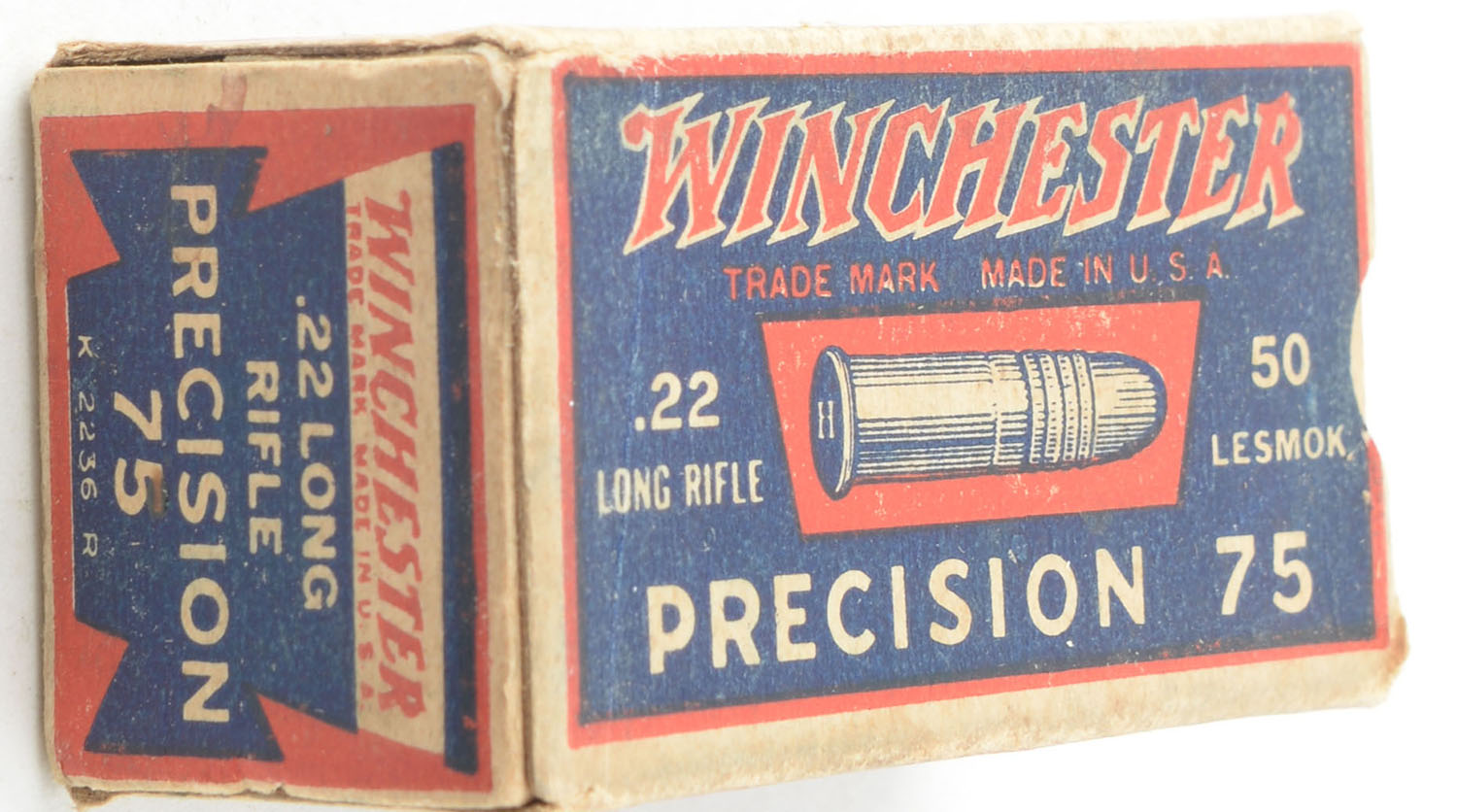 Winchester, Precision 75, .22 Long Rifle, RHWeb: WRA-53 LR-10, Full, 1pc. Blue red & white box, box is solid with very good to excellent color, minor age soiling & corner wear, edges are crisp, end flaps are solid, ammo is very good. Grade: Excellent - Value: 1000 to 1500