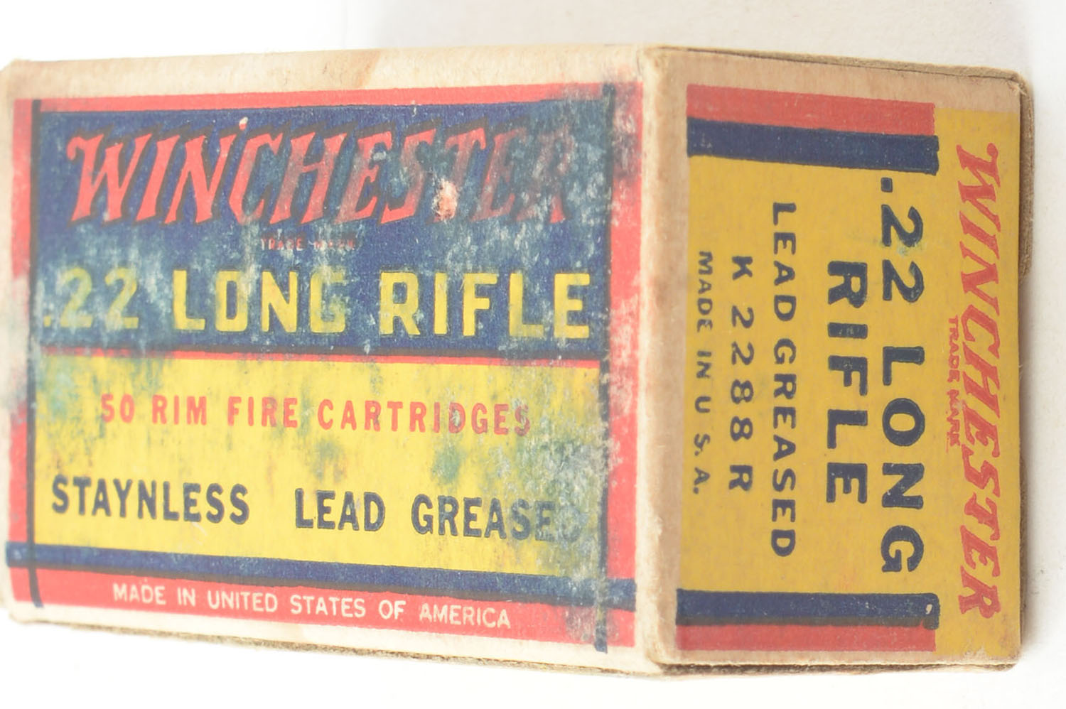 Winchester, Staynless, .22 Long Rifle, Army Lot T 210, Full, 1pc. Yellow blue & red box, box is solid with very good color, minor age soiling, shelf wear, staining on bottom front & back sides, very minor corner wear, edges are mostly crisp, end flaps are solid, ammo is excellent. Grade: Very Good - Value: 10 to 15
