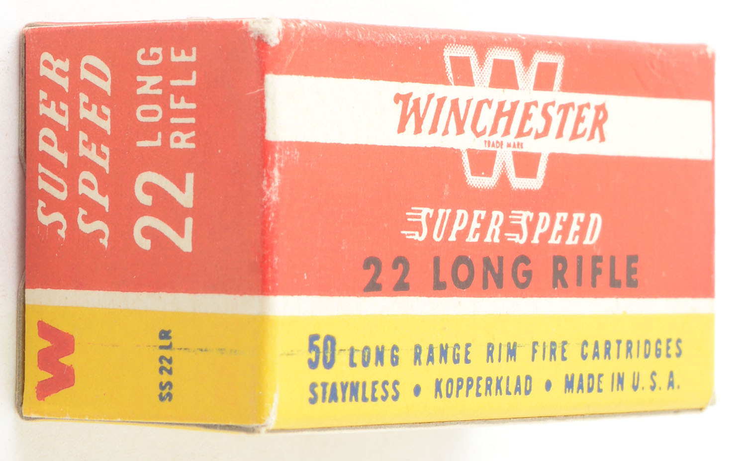 Winchester, Super Speed, .22 Long Rifle, RHWeb: WRA-17 LR-1d, Full, 1pc. Red yellow & white box, box is near mint with minty color, only very minor corner wear, edges are crisp, end flaps are solid, ammo is minty. Grade: Excellent ++ - Value: 10 to 15
