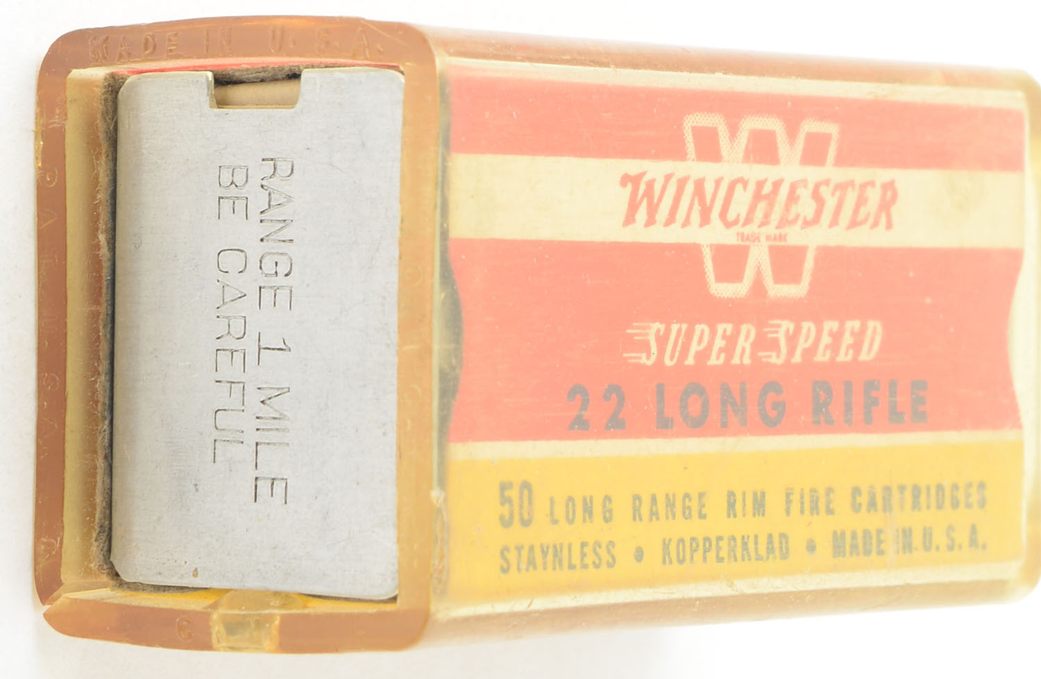 Winchester, Super Speed, .22 Long Rifle, RHWeb: WRA-17 LR-1d (nickel cases), Full, 1pc. Red yellow & white box inside an O.I.C. Plastic case from the 1940's with a sliding aluminum tray, missing both end flaps, excellent color, very minor age soiling, O.I.C. case is solid with some yellowing, ammo is excellent. Grade: Excellent - Value: 40 to 60