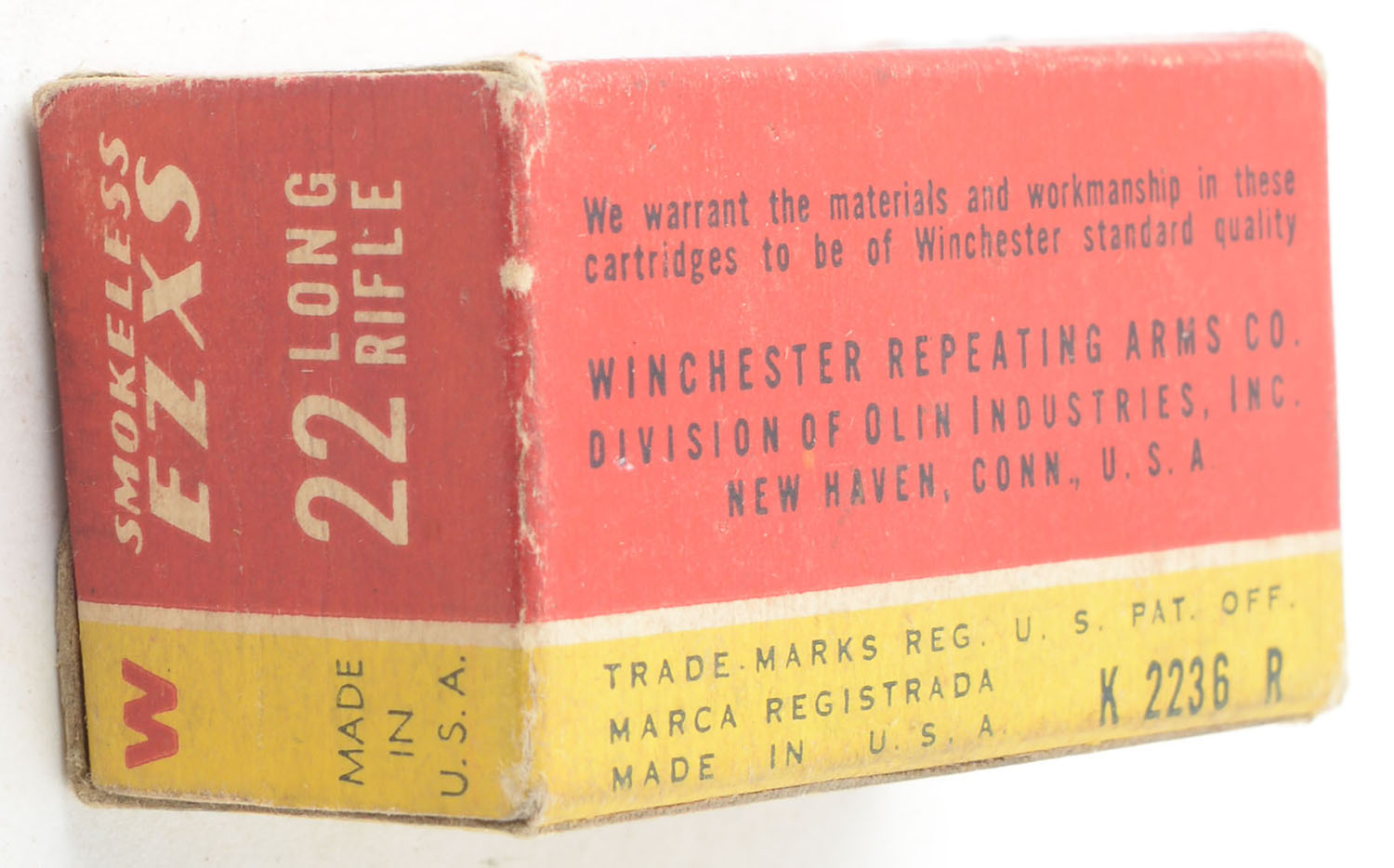 Winchester, Smokeless EZXS, .22 Long Rifle, Match Cartridges, RHWeb: WRA-54 LR-7, Full, 1pc. Red yellow & blue box, box is solid with very good color, minor age soiling, very minor edge & corner wear, end flaps are solid, ammo is very good. Grade: Very Good ++ - Value: 12 to 18