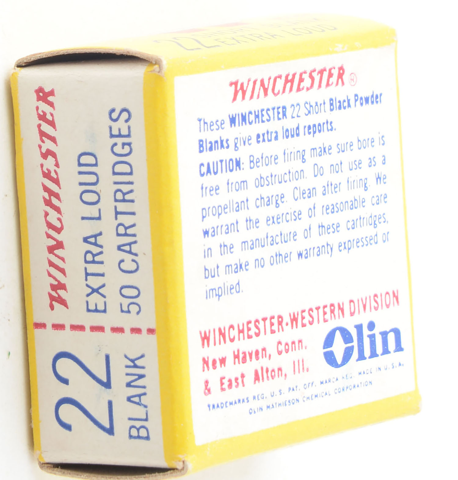Winchester, Blank Cartridges, .22 Short, Black Powder, RHWeb: WRA-19 S-1a, Full, 1pc. Yellow red & white box, box is MINT with minty color, corners are sharp, edges are crisp, end flaps are solid, ammo is poor to fair. Grade: MINT - Value: 10 to 15