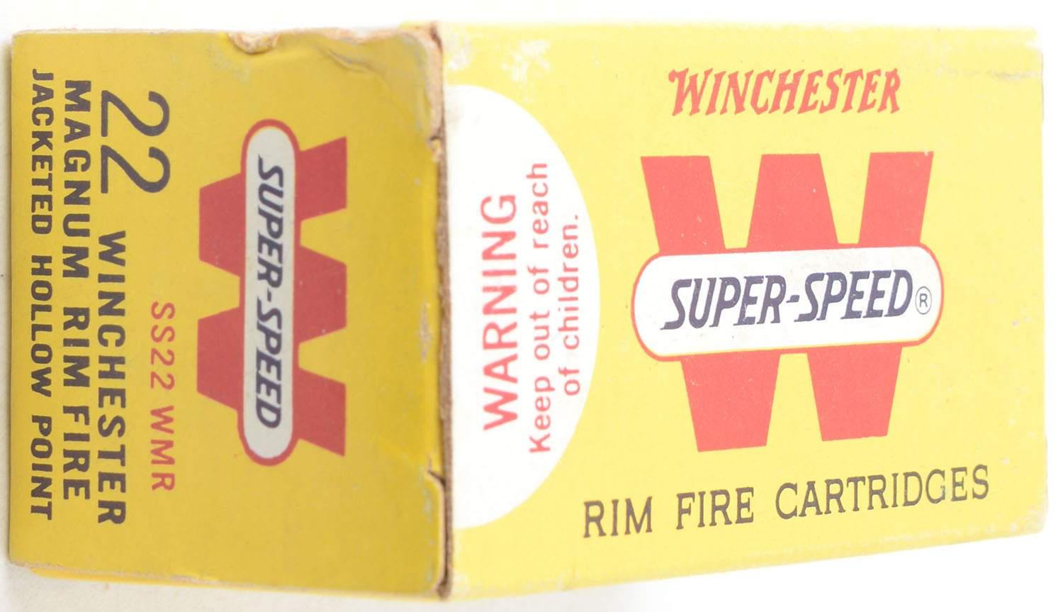 Winchester, Super-Speed, .22 Winchester Magnum Hollow Point, 40 Grain Jacketed Hollow Point, RHWeb: WRA-20 WMR-2a, Full, 1pc. Yellow white & red box, box is solid with excellent to minty color, very minor corner wear, edges are crisp, end flaps are solid, ammo is excellent to minty. Grade: Excellent + - Value: 20 to 30