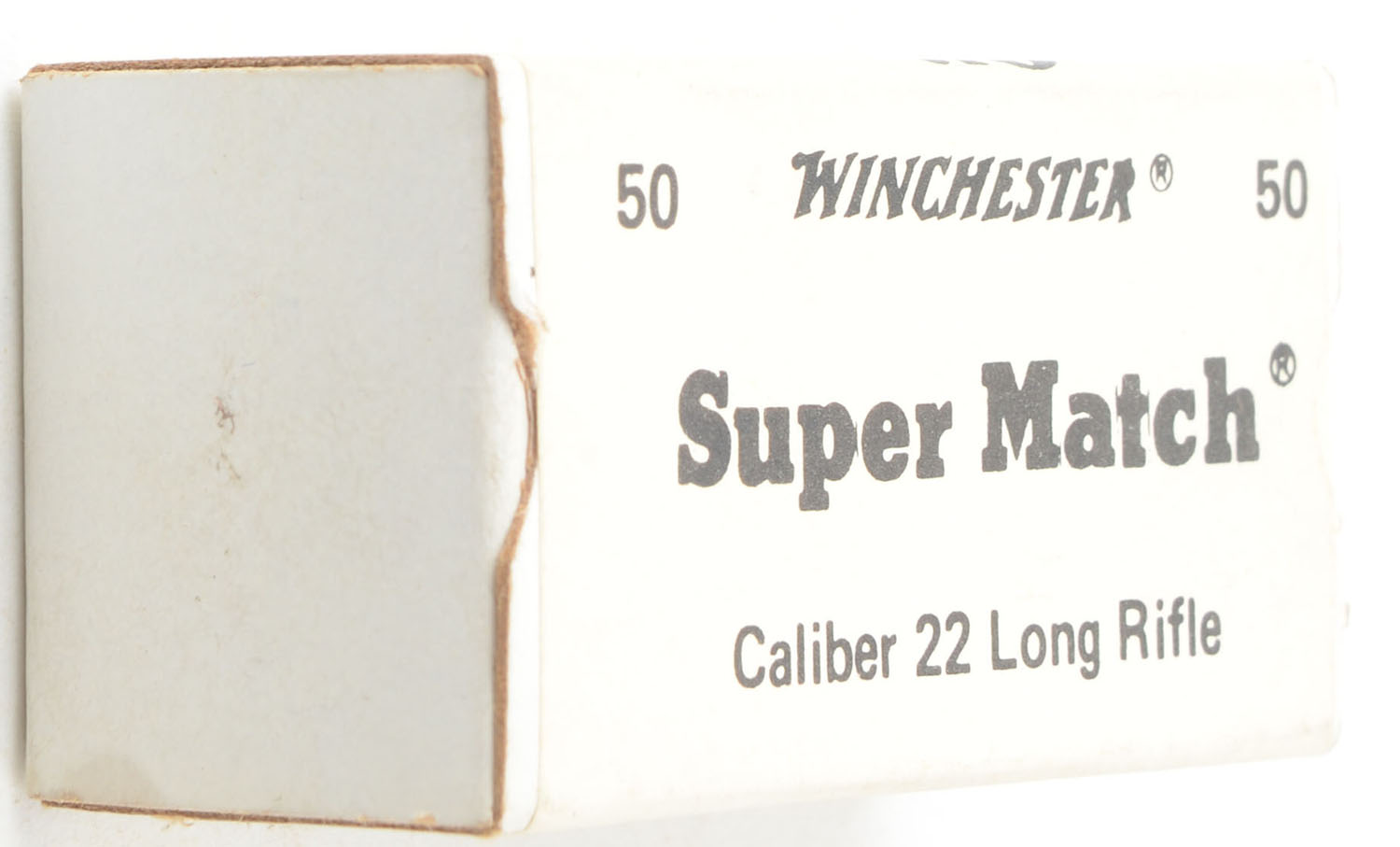 Winchester, Super Match, .22 Long Rifle, RHWeb: WRA-69 LR-2, Full, 1pc. White box with black printing, box is solid with excellent color, very minor age soiling, corners are mostly sharp, edges are crisp, end flaps are solid, ammo is excellent to minty. Grade: Excellent + - Value: 30 to 45