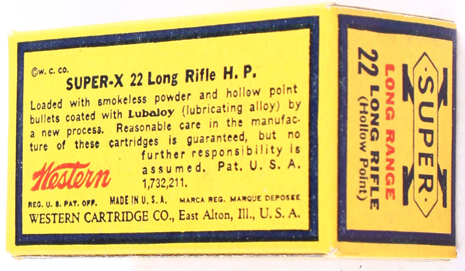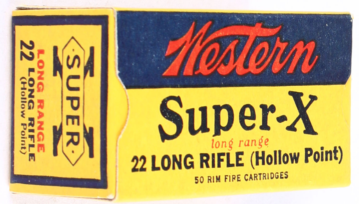 Western, Super-X, .22 Long Rifle Hollow Point, Long Range, RHWeb: Super-X-Long Rifle-24 LRHP-8, Full, 1pc. Yellow blue & red box, box is near mint with excellent color, only very minor age soiling, corners are sharp, edges are crisp, end flaps are solid, ammo is excellent. Grade: Excellent ++ - Value: 20 to 30