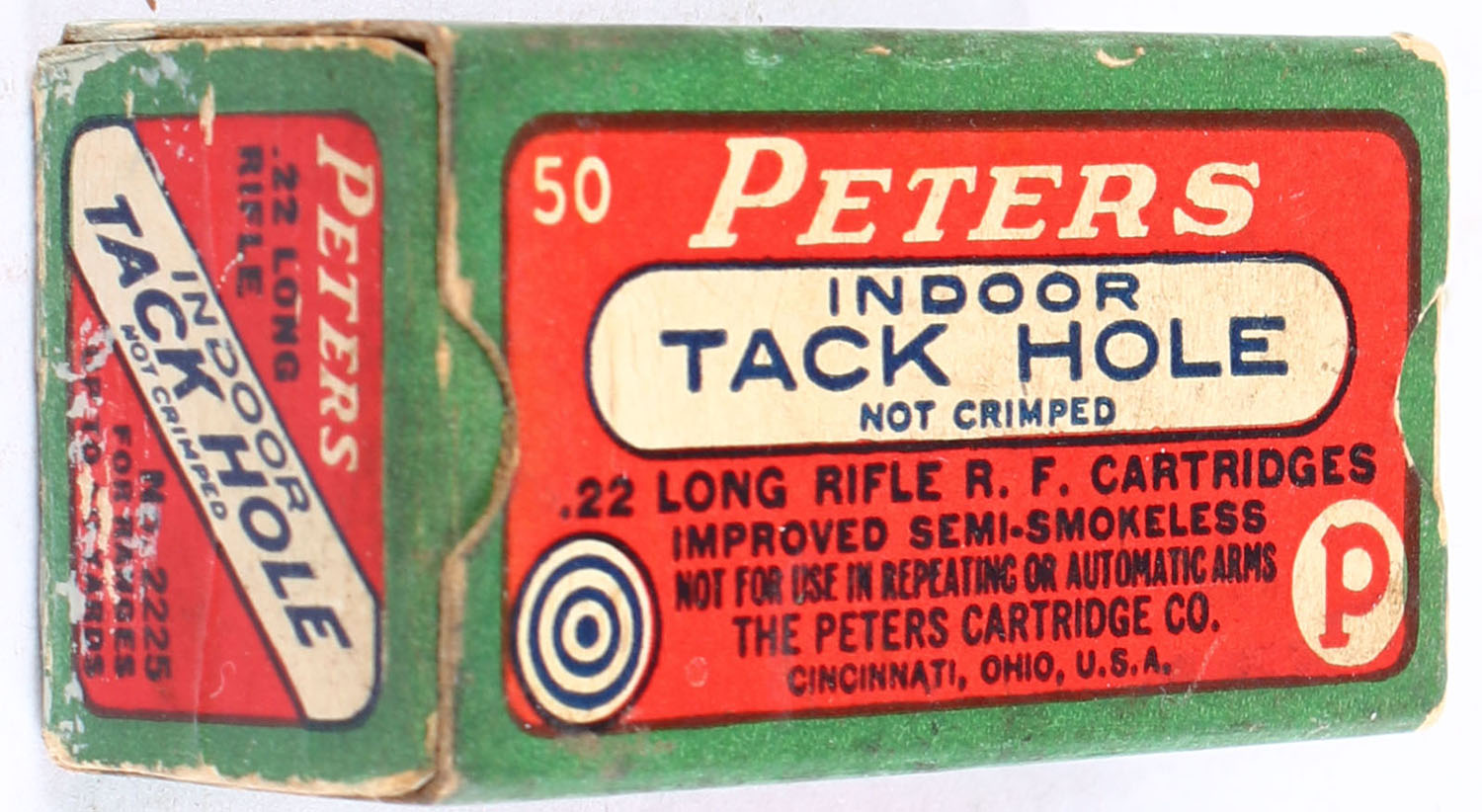 Peters, Indoor Tack Hole, .22 Long Rifle, Not Crimped, Improved Semi-Smokeless, RHWeb: PCC-52 LR-8, Full, 1pc. Red green & white box, right end flap is torn & taped, excellent color, very minor age soiling, minor corner wear, edges are mostly crisp, end flaps are solid, ammo is very good. Grade: Very Good - Value: 200 to 300