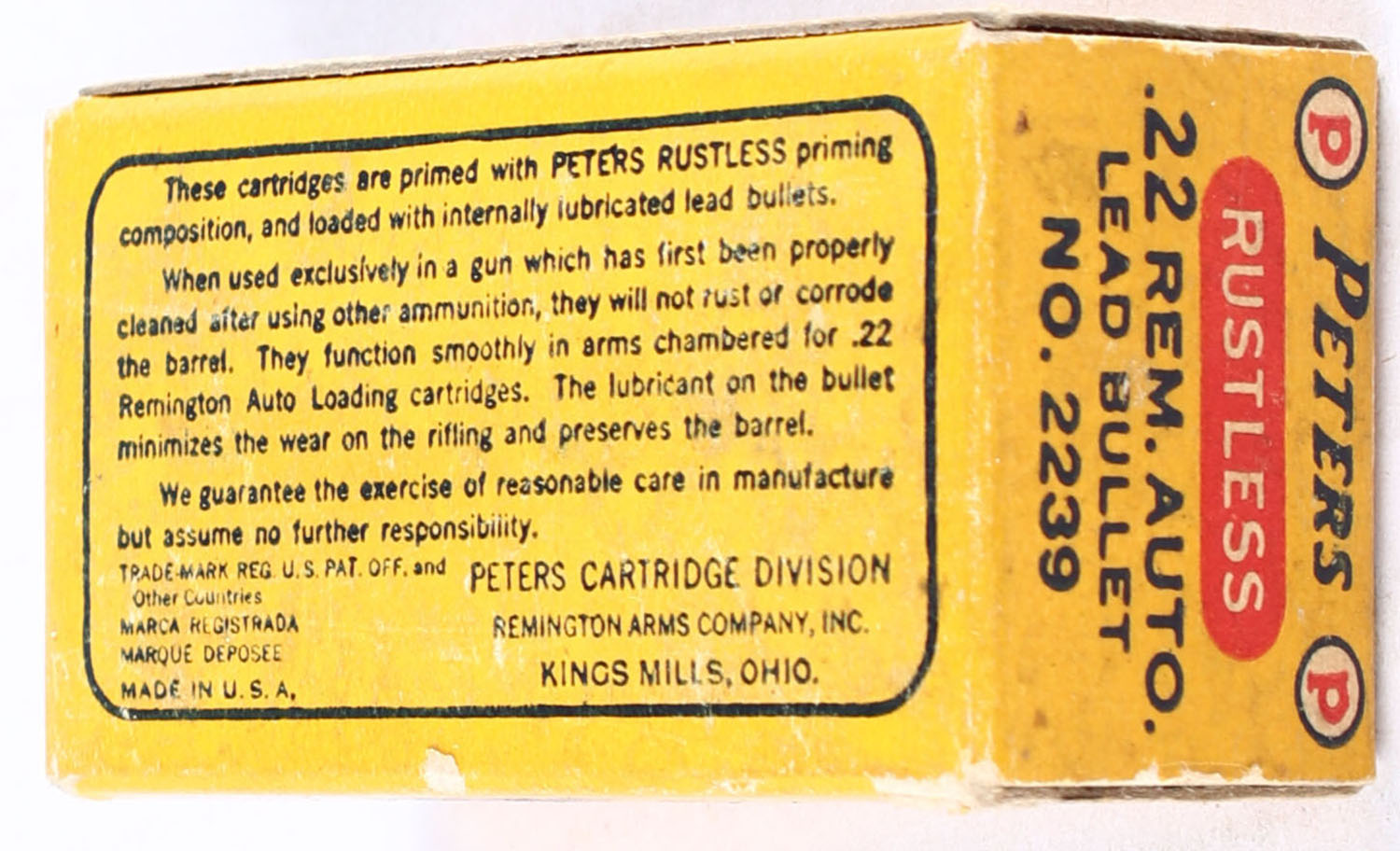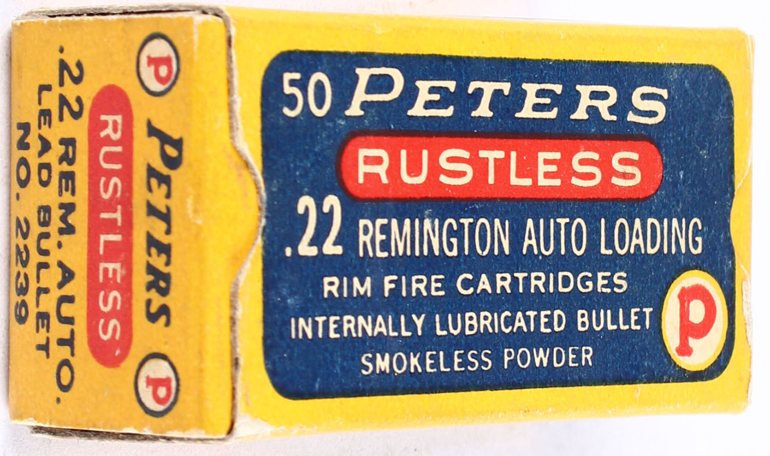 Peters, Rustless, .22 Remington Autoloading, Internally Lubricated, RHWeb: PCC-8C RA-3, Full, 1pc. Blue yellow & red box, box is solid with excellent color, minor corner wear, very minor edge wear, end flaps are solid, ammo is very good to excellent. Grade: Excellent - Value: 80 to 120