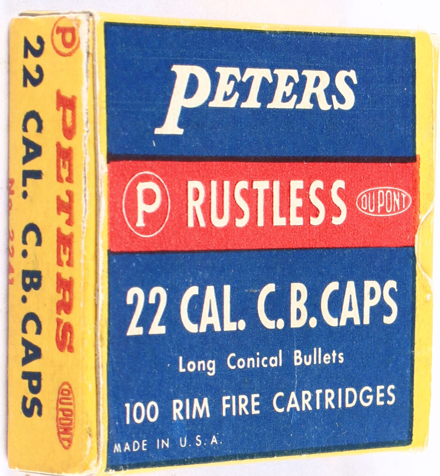 Peters, Rustless, .22 C.B. Caps, RHWeb: PCC-8D CB-1a, Full, 1pc. Blue yellow & red box, box is solid with excellent color, minor corner wear, edges are mostly crisp, end flaps are solid, ammo is excellent to minty. Grade: Excellent + - Value: 50 to 75