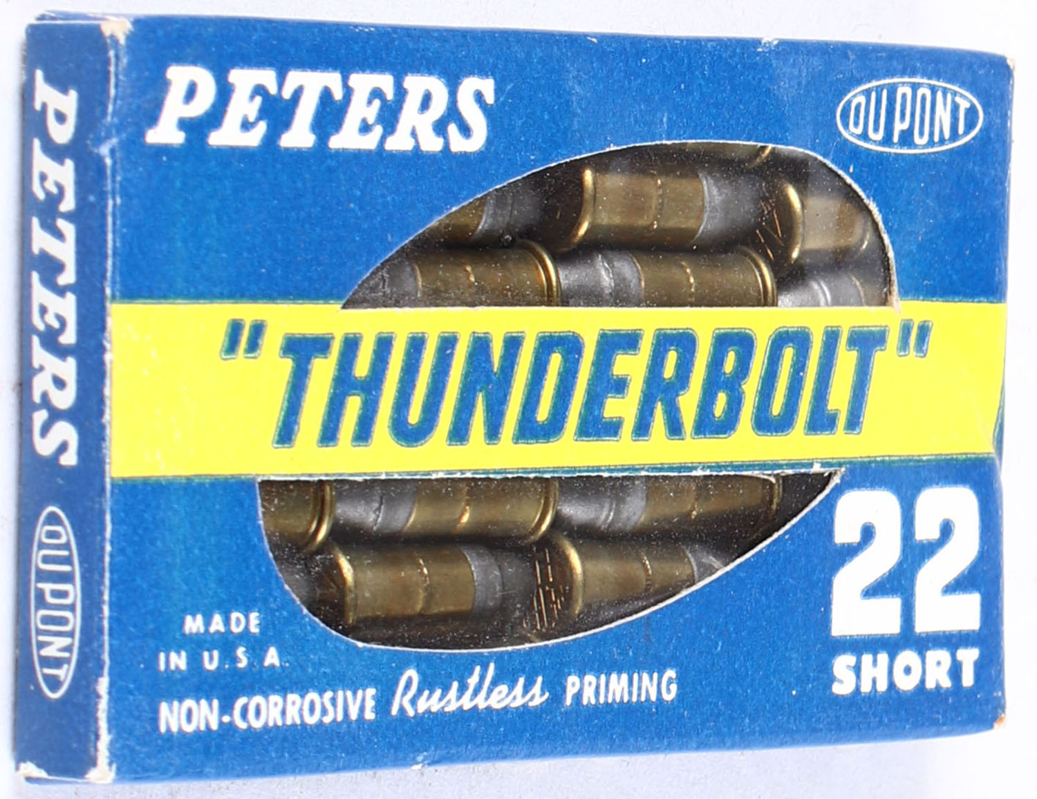 Peters, ''Thunderbolt'', .22 Short, RHWeb: PCC-17 S-5, Full, 1pc. Blue yellow & white flat pack, pack is solid with minty color, crease on top, very minor corner wear, edges are mostly crisp, end flaps are solid, ammo appears minty. Grade: Excellent - Value: 50 to 75
