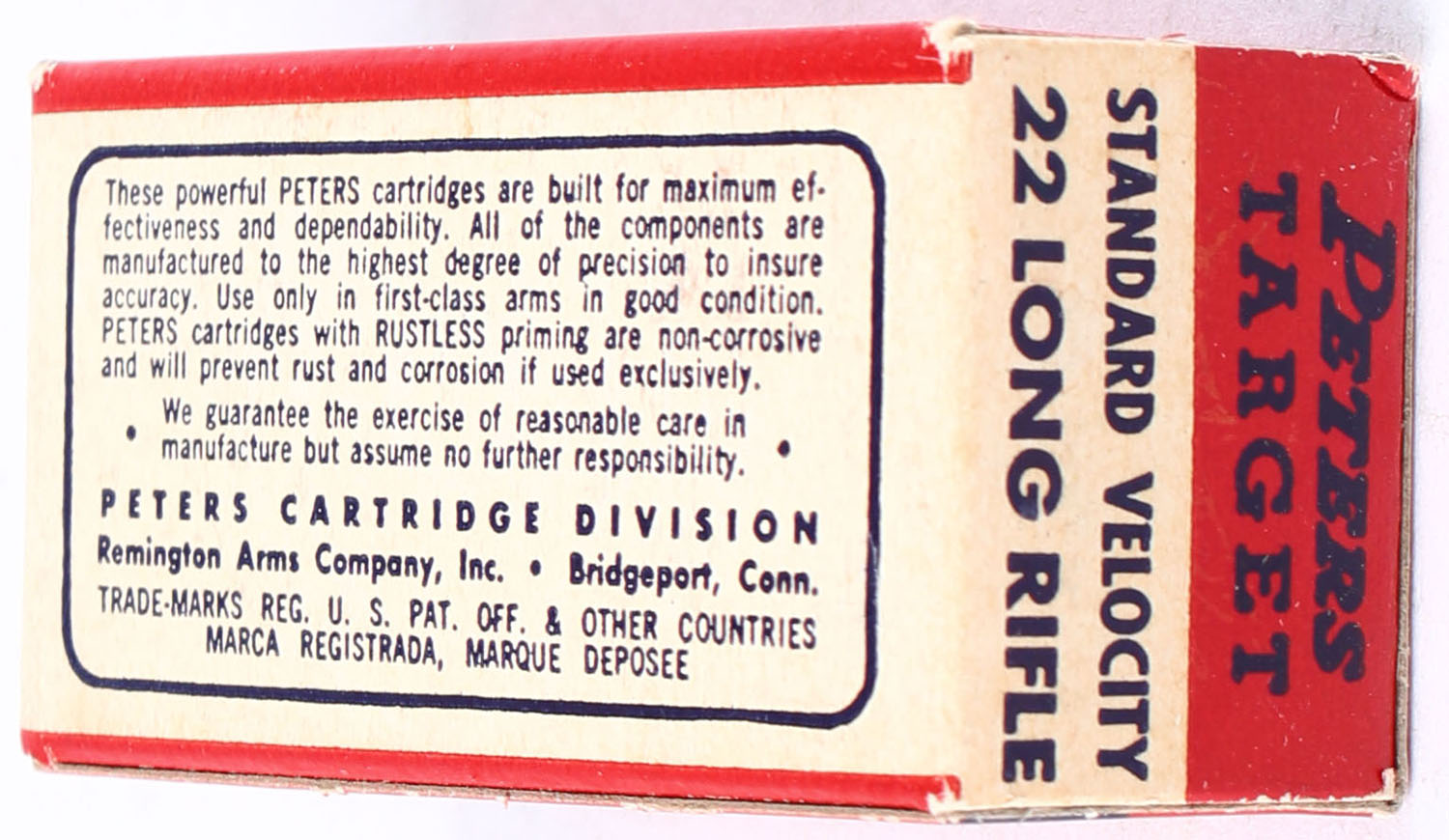 Peters, Target, .22 Long Rifle, Standard Velocity, RHWeb: PCC-54C LR-2.2d, Full, 1pc. Red black & white box, box is solid with excellent color, minor corner wear, edges are crisp, end flaps are solid, ammo is excellent. Grade: Excellent + - Value: 12 to 18