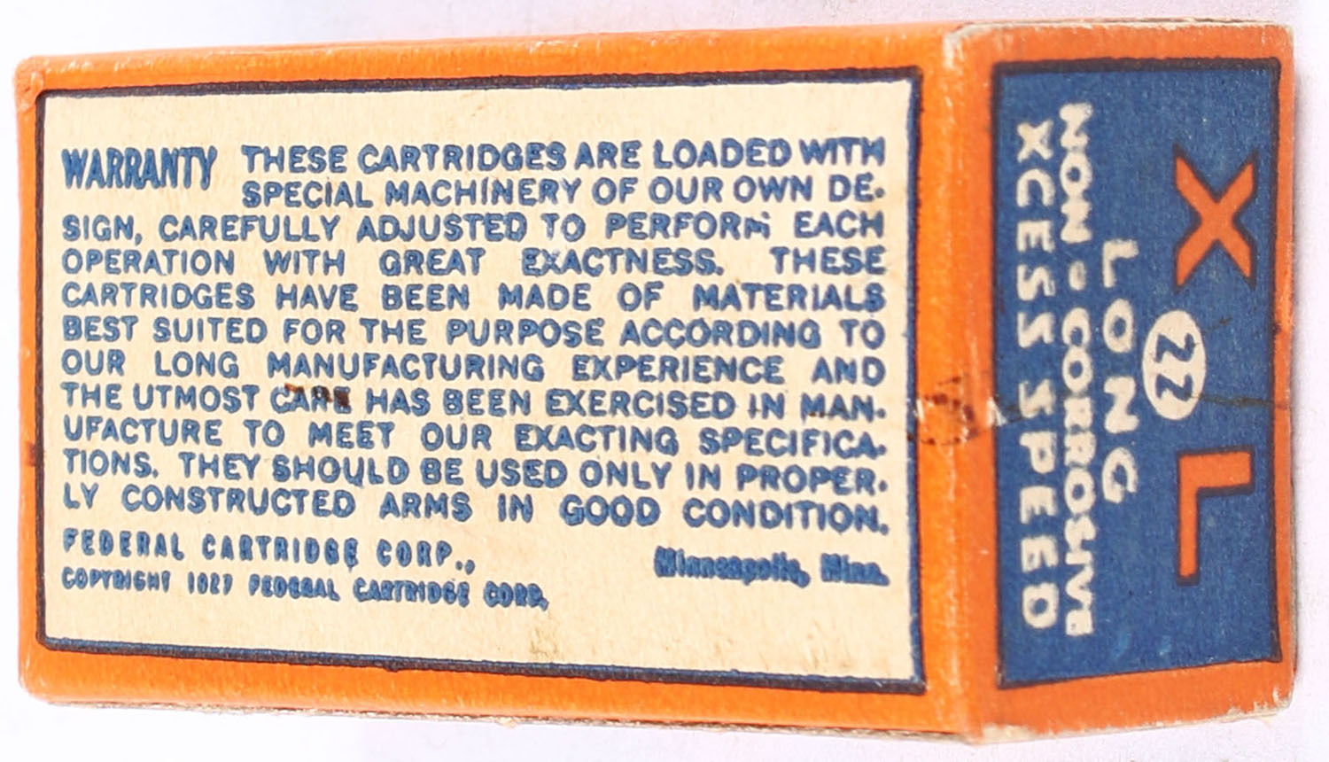 Federal, XL Cartridges, .22 Long, RHWeb: FCC-4.1 L-1 (with #4 end flap), Full, 1pc. Blue orange & white box, box is solid with excellent color, minor age soiling, corners are mostly sharp, edges are crisp, end flaps are solid, ammo is excellent. Grade: Excellent - Value: 220 to 330
